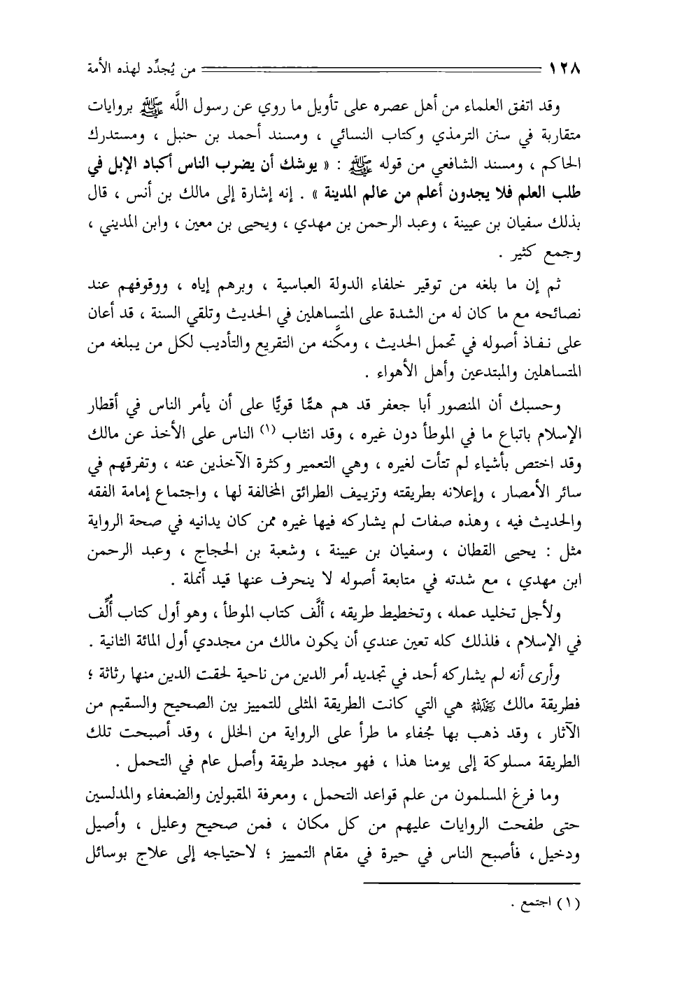 ولأجل تخليد عمله، وتخطيط طريقه، ألف كتاب الموطأ، وهو أول كتاب ألف في الإسلام، فلذلك كله تعين عندي أن يكون مالك من مجددي أول المائة الثانية.