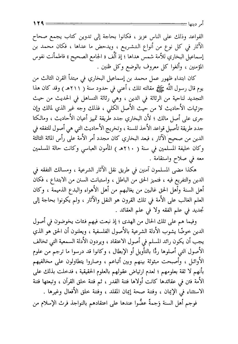 القواعد وذلك على الناس عزيز، فكانوا بحاجة إلى تدوين كتاب يجمع صحاح الآثار في كل نوع من أنواع التشريع، ويدحض ما عداها، فكان محمد بن إسماعيل البخاري للأمة شمس هداها؛ إذ ألف «الجامع الصحيح» فاطمأنت نفوس المؤمنين، وألغوا كل معروف بالوضع وكل ظنين.
