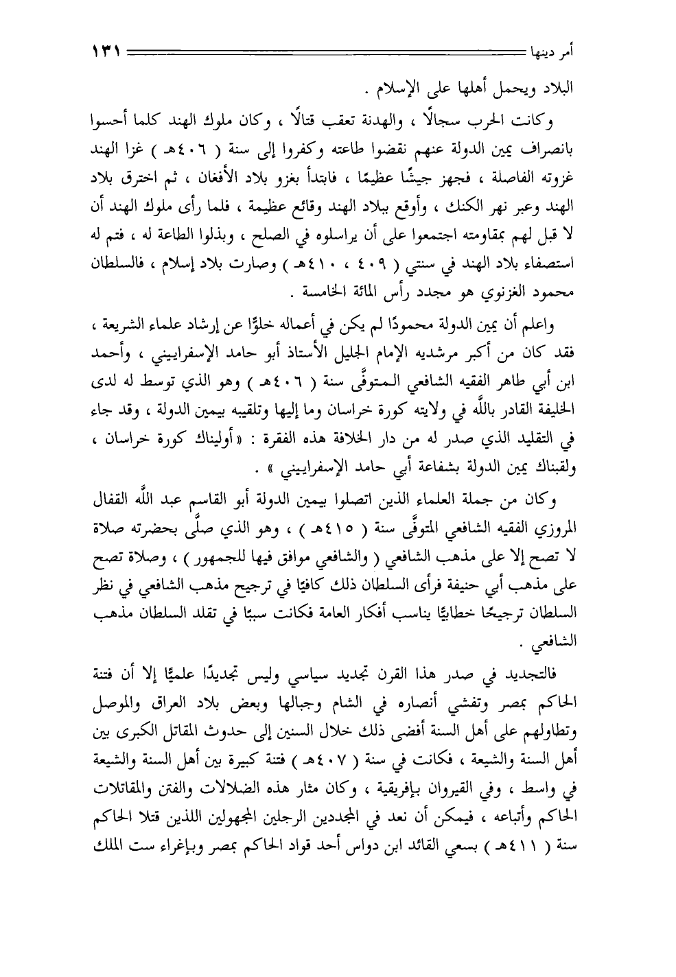 وكانت الحرب سجالاً، والهدنة تعقب قتالاً، وكان ملوك الهند كلما أحسوا بانصراف يمين الدولة عنهم نقضوا طاعته وكفروا إلى سنة (406 هـ) غزا الهند غزوته الفاصلة، فجهز جيشًا عظيمًا، فابتدأ بغزو بلاد الأفغان، ثم اخترق بلاد الهند وعبر نهر الكنك، وأوقع ببلاد الهند وقائع عظيمة، فلما رأى ملوك الهند أن لا قبل لهم بمقاومته اجتمعوا على أن يراسلوه في الصلح، وبذلوا الطاعة له، فتم له استصفاء بلاد الهند في سنتي (409، 410 هـ) وصارت بلاد إسلام، فالسلطان محمود الغزنوي هو مجدد رأس المائة الخامسة.