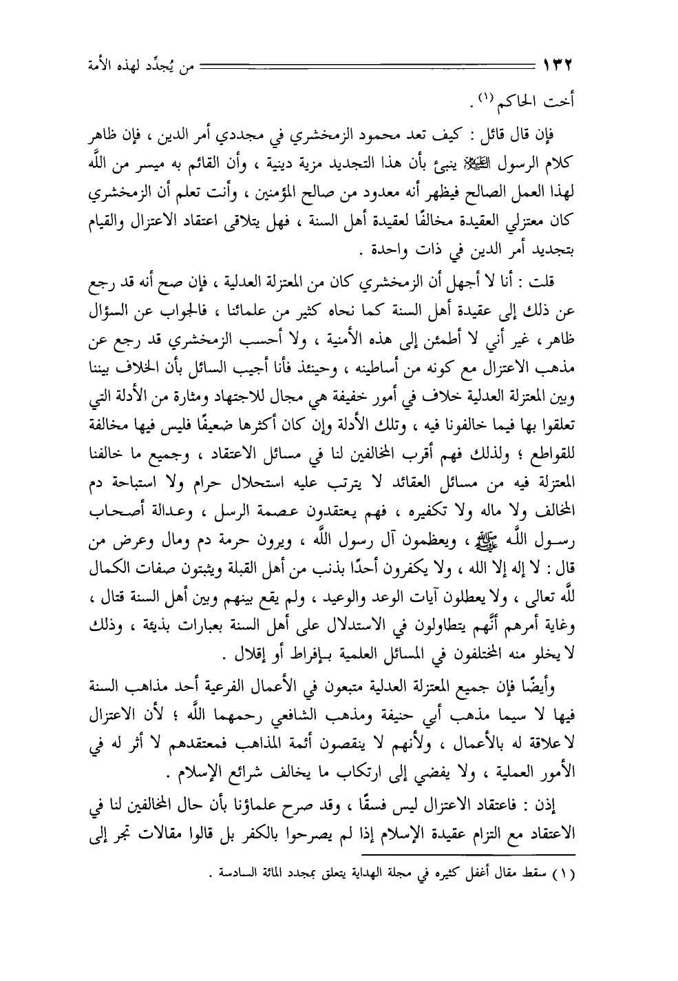فإن قال قائل: كيف تعد محمود الزمخشري في مجددي أمر الدين، فإن ظاهر كلام الرسول - عليه السلام - ينبئ بأن هذا التجديد مزية دينية، وأن القائم به ميسر من الله لهذا العمل الصالح فيظهر أنه معدود من صالح المؤمنين، وأنت تعلم أن الزمخشري كان معتزلي العقيدة مخالفًا لعقيدة أهل السنة، فهل يتلاقى اعتقاد الاعتزال والقيام بتجديد أمر الدين في ذات واحدة.