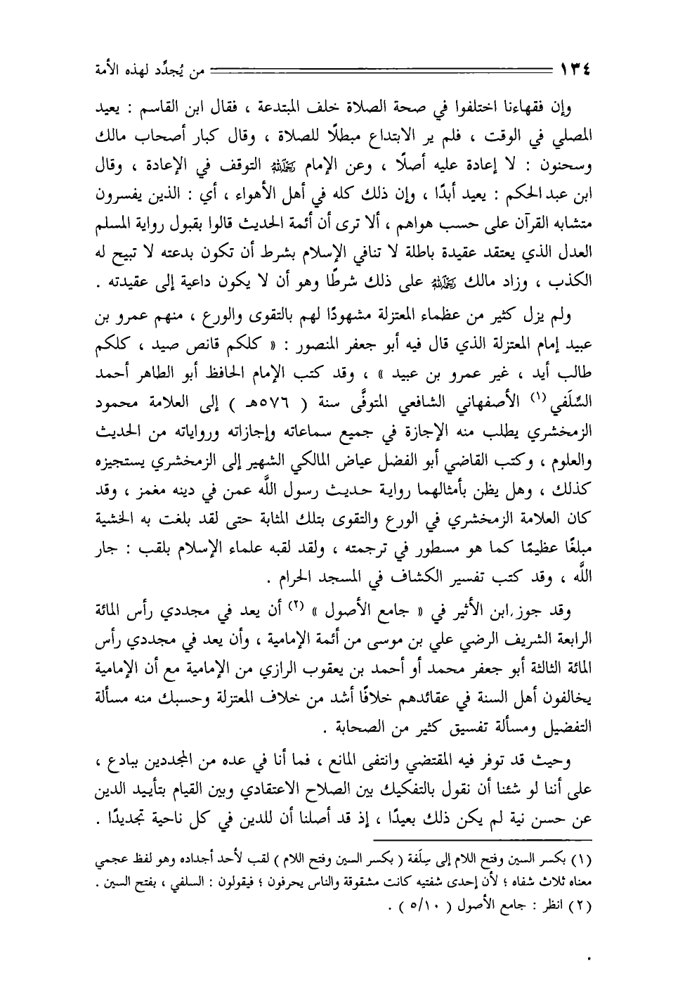 وقد جوز، ابن الأثير في «جامع الأصول» أن يعد في مجددي رأس المائة الرابعة الشريف الرضي علي بن موسى من أئمة الأمامية، وأن يعد في مجددي رأس المائة الثالثة أبو جعفر محمد أو أحمد بن يعقوب الرازي من الأمامية مع أن الأمامية يخالفون أهل السنة في عقائدهم خلافًا أشد من خلاف المعتزلة وحسبك منه مسألة التفضيل ومسألة تفسيق كثير من الصحابة.