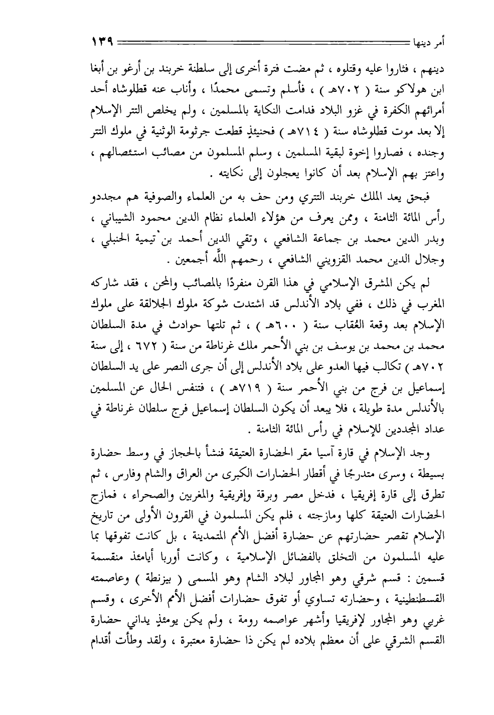 دينهم، فثاروا عليه وقتلوه، ثم مضت فترة أخرى إلى سلطنة خربند بن أرغو بن أبغا ابن هولاكو سنة (702 هـ)، فأسلم وتسمى محمدًا، وأناب عنه قطلوشاه أحد أمرائهم الكفرة في غزو البلاد فدامت النكاية بالمسلمين، ولم يخلص التتر الإسلام إلا بعد موت قطلوشاه سنة (714 هـ) فحينئذ قطعت جرثومة الوثنية في ملوك التتر وجنده، فصاروا إخوة لبقية المسلمين، وسلم المسلمون من مصائب استئصالهم، واعتز بهم الإسلام بعد أن كانوا يعجلون إلى نكايته.