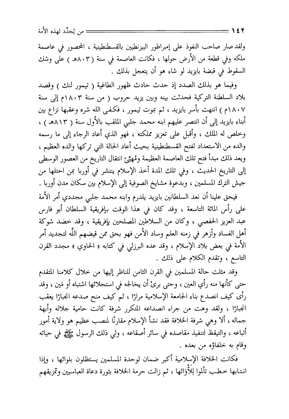 فيحق علينا أن نعد السلطانين بايزيد يلدرم وابنه محمد جلبي مجددي أمر الأمة على رأس المائة التاسعة، وقد كان في هذا الوقت بإفريقية السلطان أبو فارس عبد العزيز الحفصي، وكان من السلاطين المصلحين بإفريقية، وقد خضد شوكة أهل الفساد وأزهر في زمنه العلم وساد الأمن فهو بحق ممن قيضهم الله لتجديد أمر الأمة في بعض بلاد الإسلام، وقد عده البرزلي في كتابه «الحاوي» مجدد القرن التاسع، وتقدم الكلام على ذلك.