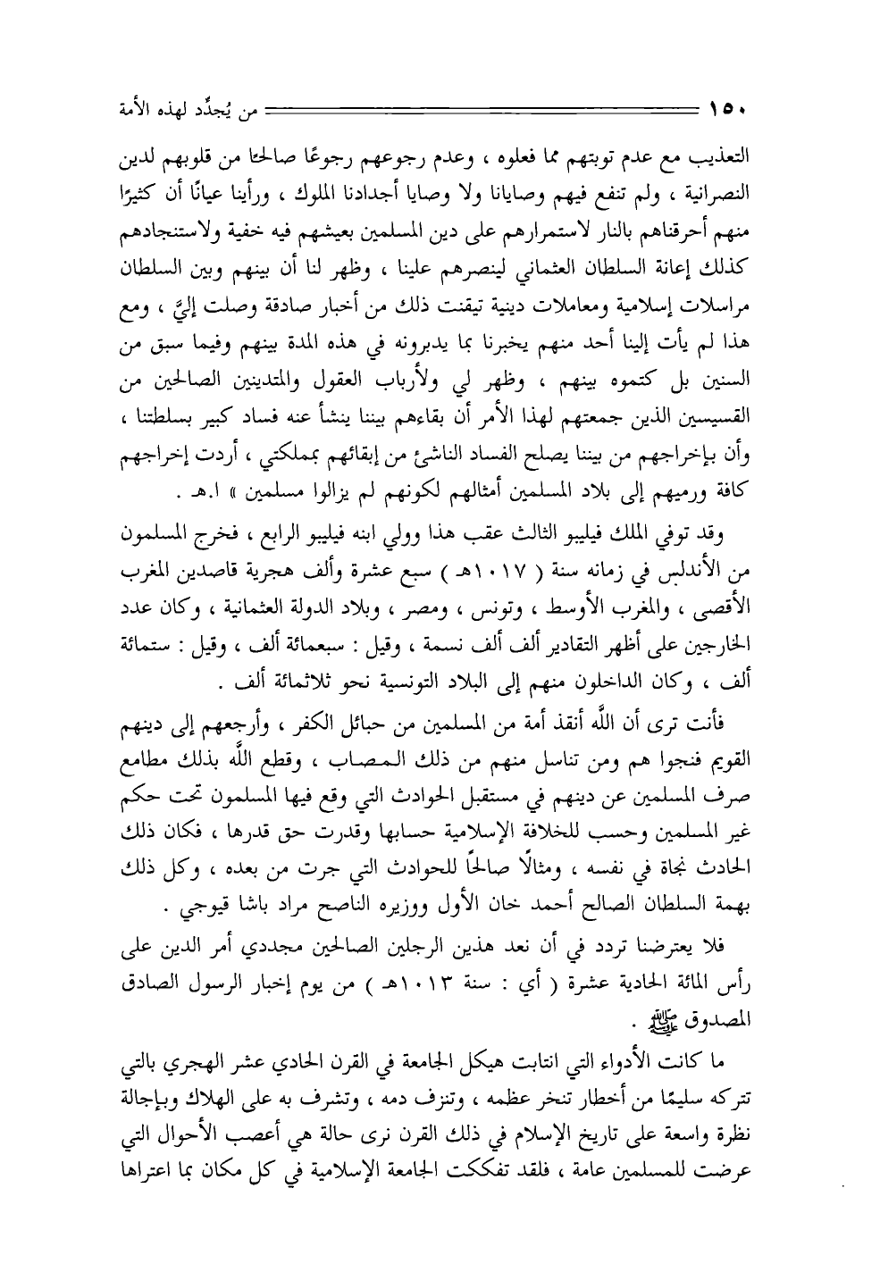 فلا يعترضنا تردد في أن نعد هذين الرجلين الصالحين مجددي أمر الدين على رأس المائة الحادية عشرة (أي: سنة 1013 هـ) من يوم إخبار الرسول الصادق المصدوق - صلى الله عليه وسلم -.