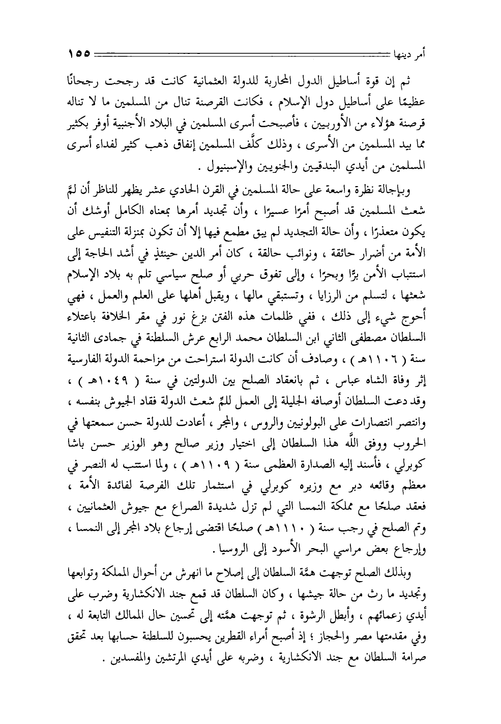 وبإجالة نظرة واسعة على حالة المسلمين في القرن الحادي عشر يظهر للناظر أن لم شعث المسلمين قد أصبح أمرًا عسيرًا، وأن تجديد أمرها بمعناه الكامل أوشك أن يكون متعذرًا، وأن حالة التجديد لم يبق مطمع فيها إلا أن تكون بمنزلة التنفيس على الأمة من أضرار حائقة، ونوائب حالقة، كان أمر الدين حينئذٍ في أشد الحاجة إلى استتباب الأمن برًا وبحرًا، وإلى تفوق حربي أو صلح سياسي تلم به بلاد الإسلام شعثها، لتسلم من الرزايا، وتستبقي مالها، ويقبل أهلها على العلم والعمل، فهي أحوج شيء إلى ذلك، ففي ظلمات هذه الفتن بزغ نور في مقر الخلافة باعتلاء السلطان مصطفى الثاني ابن السلطان محمد الرابع عرش السلطنة في جمادى الثانية سنة (1106 هـ)، وصادف أن كانت الدولة استراحت من مزاحمة الدولة الفارسية إثر وفاة الشاه عباس، ثم بانعقاد الصلح بين الدولتين في سنة (1049 هـ)، وقد دعت السلطان أوصافه الجليلة إلى العمل للم شعث الدولة فقاد الجيوش بنفسه، وانتصر انتصارات على البولونيين والروس، والمجر، أعادت للدولة حسن سمعتها في الحروب ووفق الله هذا السلطان إلى اختيار وزير صالح وهو الوزير حسن باشا كوبرلي، فأسند إليه الصدارة العظمى سنة (1109 هـ)، ولما استتب له النصر في معظم وقائعه دبر مع وزيره كوبرلي في استثمار تلك الفرصة لفائدة الأمة، فعقد صلحًا مع مملكة النمسا التي لم تزل شديدة الصراع مع جيوش العثمانيين، وتم الصلح في رجب سنة (1110 هـ) صلحًا اقتضى إرجاع بلاد المجر إلى النمسا، وإرجاع بعض مراسي البحر الأسود إلى الروسيا.