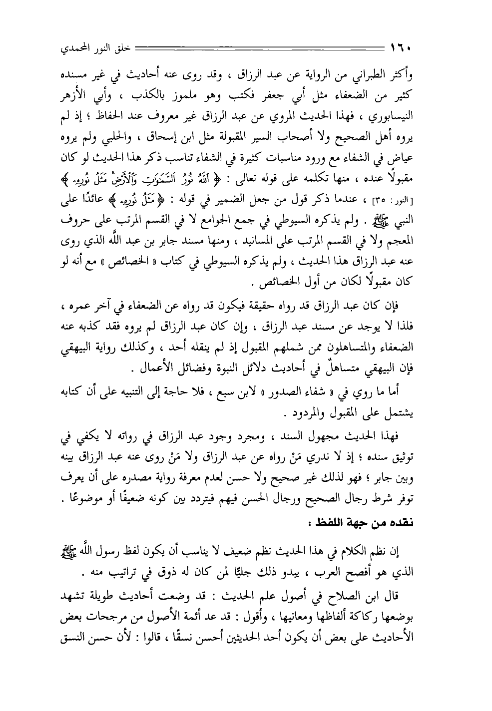 وأكثر الطبراني من الرواية عن عبد الرزاق، وقد روى عنه أحاديث في غير مسنده كثير من الضعفاء مثل أبي جعفر فكتب وهو ملموز بالكذب، وأبي الأزهر النيسابوري، فهذا الحديث المروي عن عبد الرزاق غير معروف عند الحفاظ؛ إذ لم يروه أهل الصحيح ولا أصحاب السير المقبولة مثل ابن إسحاق، والحلبي ولم يروه عياض في الشفاء مع ورود مناسبات كثيرة في الشفاء تناسب ذكر الحديث لو كان مقبولاً عنده، منها تكلمه على قوله تعالى: {اللَّهُ نُورُ السَّمَاوَاتِ وَالْأَرْضِ مَثَلُ نُورِهِ} [النور: 35]، عندما ذكر قول من جعل الضمير في قوله: {مثل نوره} [النور: 35] عائدًا على النبي - صلى الله عليه وسلم -. ولم يذكره السيوطي في جمع الجوامع لا في القسم المرتب على حروف المعجم ولا في القسم المرتب على المسانيد، ومنها مسند جابر بن عبد الله الذي روى عنه عبد الرزاق هذا الحديث، ولم يذكره السيوطي في كتاب «الخصائص» مع أنه لو كان مقبولاً لكان من أول الخصائص.
