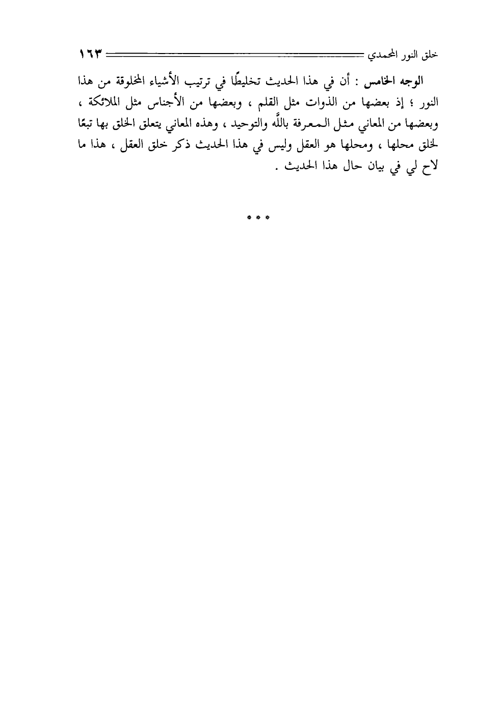 الوجه الخامس: أن في هذا الحديث تخليطًا في ترتيب الأشياء المخلوقة من هذا النور؛ إذ بعضها من الذوات مثل القلم، وبعضها من الأجناس مثل الملائكة، وبعضها من المعاني مثل المعرفة بالله والتوحيد، وهذه المعاني يتعلق الخلق بها تبعًا لخلق محلها، ومحلها هو العقل وليس في هذا الحديث ذكر خلق العقل، هذا ما لاح لي في بيان حال هذا الحديث.
