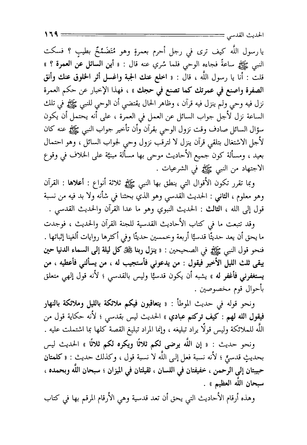 وبما تقرر تكون الأقوال التي ينطق بها النبي - صلى الله عليه وسلم - ثلاثة أنواع: أعلاها: القرآن وهو معلوم، الثاني: الحديث القدسي وهو الذي بحثنا في شأنه ولابد فيه من نسبة قول إلى الله، الثالث: الحديث النبوي وهو ماعدا القرآن والحديث القدسي.
