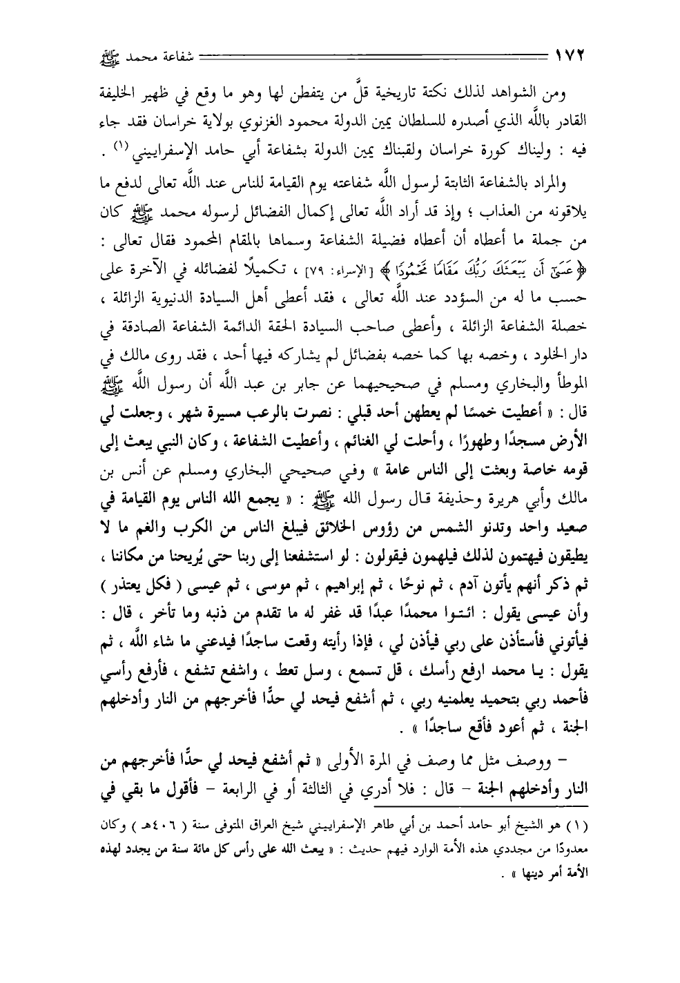 والمراد بالشفاعة الثابتة لرسول الله شفاعته يوم القيامة للناس عند الله تعالى لدفع ما يلاقونه من العذاب؛ وإذ قد أراد الله تعالى إكمال الفضائل لرسوله محمد - صلى الله عليه وسلم - كان من جملة ما أعطاه أن أعطاه فضيلة الشفاعة وسماها بالمقام المحمود فقال تعالى: {عَسَى أَنْ يَبْعَثَكَ رَبُّكَ مَقَامًا مَحْمُودًا (79)} [الإسراء: 79]، تكميلاً لفضائله في الآخرة على حسب ما له من السؤود عند الله تعالى، فقد أعطى أهل السيادة الدنيوية الزائلة، خصلة الشفاعة الزائلة، وأعطى صاحب السيادة الحقة الدائمة الشفاعة الصادقة في دار الخلود، وخصه بها كما خصه بفضائل لم يشاركه فيها أحد، فقد روى مالك في الموطأ والبخاري ومسلم في صحيحهما عن جابر بن عبد الله أن رسول الله - صلى الله عليه وسلم - قال: «أعطيت خمسًا لم يعطهن أحد قبلي: نصرت بالرعب مسيرة شهر، وجعلت لي الأرض مسجدًا وطهورًا، وأحلت لي الغنائم، وأعطيت الشفاعة، وكان النبي يبعث إلى قومه خاصة وبعثت إلى الناس عامة» وفي صحيحي البخاري ومسلم عن أنس بن مالك وأبي هريرة وحذيفة قال رسول الله - صلى الله عليه وسلم -: «يجمع الله الناس يوم القيامة في صعيد واحد وتدنو الشمس من رؤوس الخلائق فيبلغ الناس من الكرب والغم ما لا يطيقون فيهتمون لذلك فيلهمون فيقولون: لو استشفعنا إلى ربنا حتى يُريحنا من مكاننا، ثم ذكر أنهم يأتون آدم، ثم نوحًا، ثم إبراهيم، ثم موسى، ثم عيسى (فكل يعتذر) وأن عيسى يقول: ائتوا محمدًا عبدًا قد غفر له ما تقدم من ذنبه وما تأخر، قال: فيأتوني فأستأذن على ربي فيأذن لي، فإذا رأيته وقعت ساجدًا فيدعني ما شاء الله، ثم يقول: يا محمد ارفع رأسك، قل تسمع، وسل تعط، واشفع تشفع، فأرفع رأسي فأحمد ربي بتحميد يعلمنيه ربي، ثم أشفع فيحد لي حدًا فأخرجهم من النار وأدخلهم الجنة، ثم أعود فأقع ساجدًا».