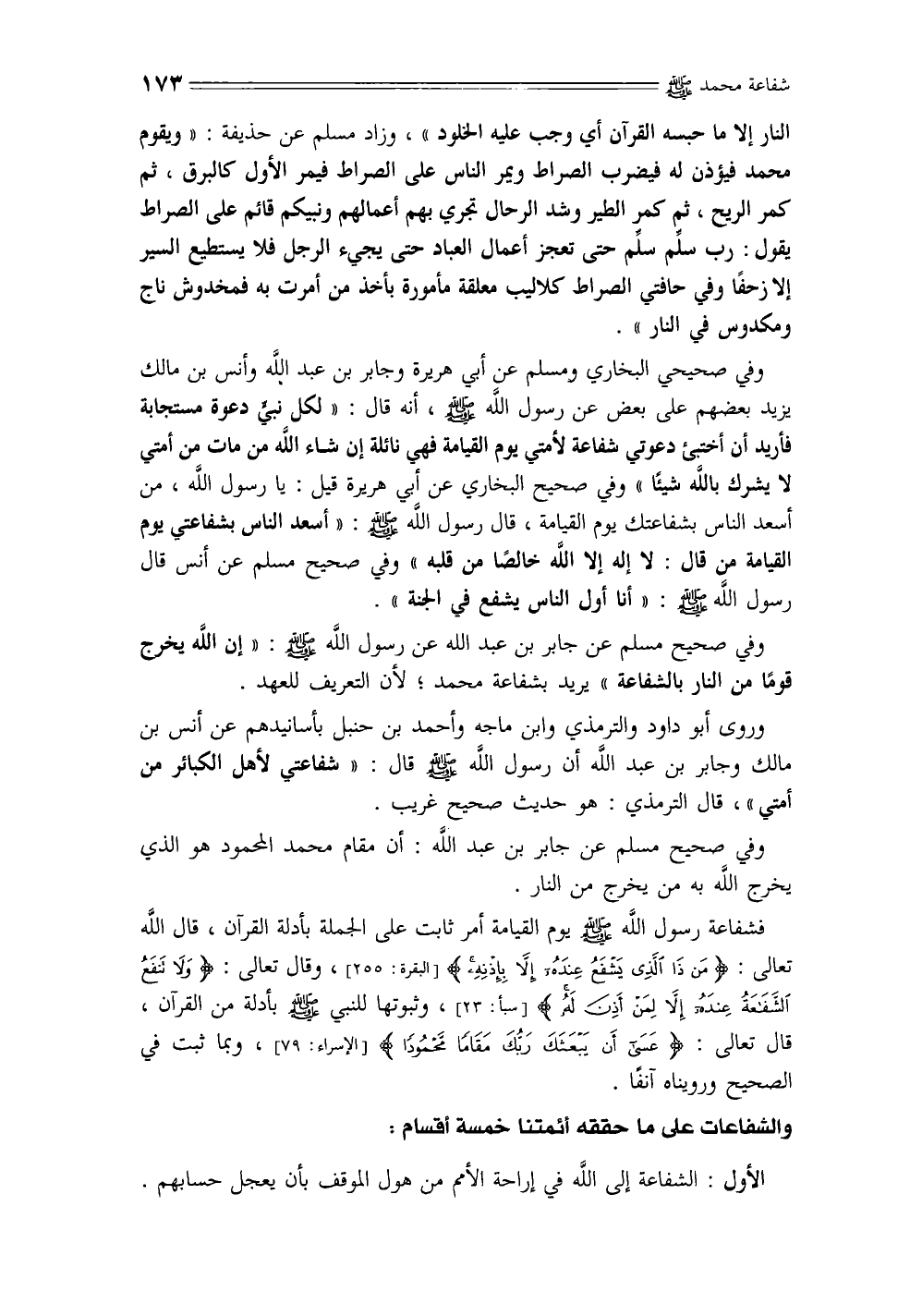 وفي صحيح مسلم عن جابر بن عبد الله عن رسول الله - صلى الله عليه وسلم -: «إن الله يخرج قومًا من النار بالشفاعة» يريد بشفاعة محمد؛ لأن التعريف للعهد.