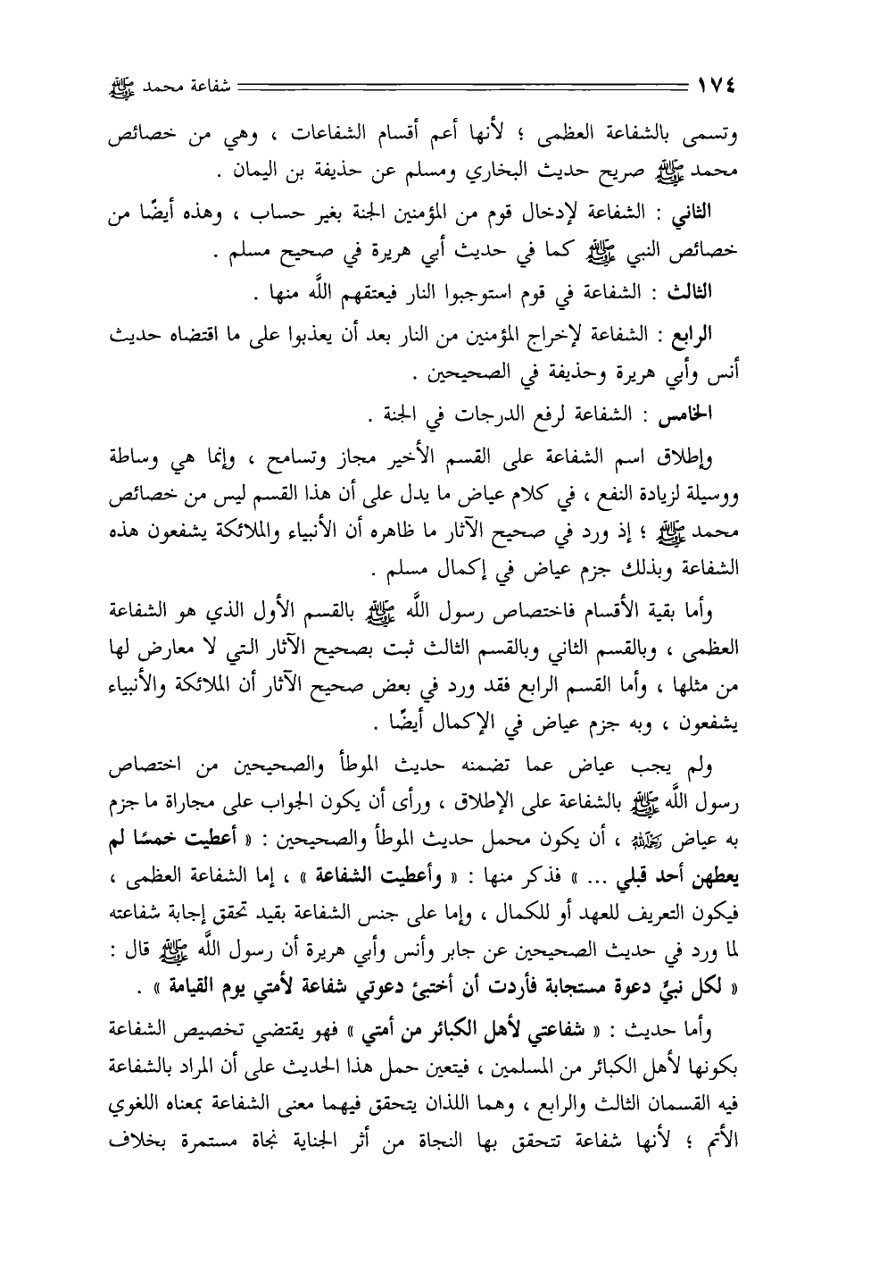 وأما بقية الأقسام فاختصاص رسول الله - صلى الله عليه وسلم - بالقسم الأول الذي هو الشفاعة العظمى، وبالقسم الثاني وبالقسم الثالث ثبت بصحيح الآثار التي لا معارض لها من مثلها، وأما القسم الرابع فقد ورد في بعض صحيح الآثار أن الملائكة والأنبياء يشفعون، وبه جزم عياض في الإكمال أيضًا.