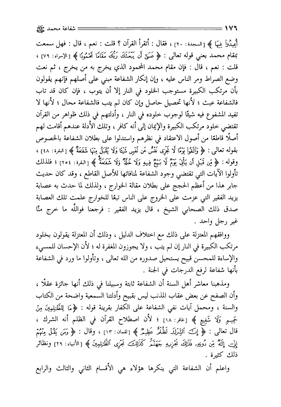 ومذهبنا معاشر أهل السنة أن الشفاعة ثابتة وسبيلنا في ذلك أنها جائزة عقلاً، وأن الصفح عن بعض عقاب المذنب ليس بقبيح وأدلتنا السمعية واضحة من الكتاب والسنة، ومحمل آيات نفي الشفاعة على الكفار بقرينة قوله: {مَا لِلظَّالِمِينَ مِنْ حَمِيمٍ وَلَا شَفِيعٍ} [غافر: 18]؛ لأن اصطلاح القرآن في الظلم أنه الشرك، قال تعالى: {إِنَّ الشِّرْكَ لَظُلْمٌ عَظِيمٌ} [لقمان: 13]، {وَمَنْ يَقُلْ مِنْهُمْ إِنِّي إِلَهٌ مِنْ دُونِهِ فَذَلِكَ نَجْزِيهِ جَهَنَّمَ كَذَلِكَ نَجْزِي الظَّالِمِينَ (29)} [الأنبياء: 29] ونظائر ذلك كثيرة.