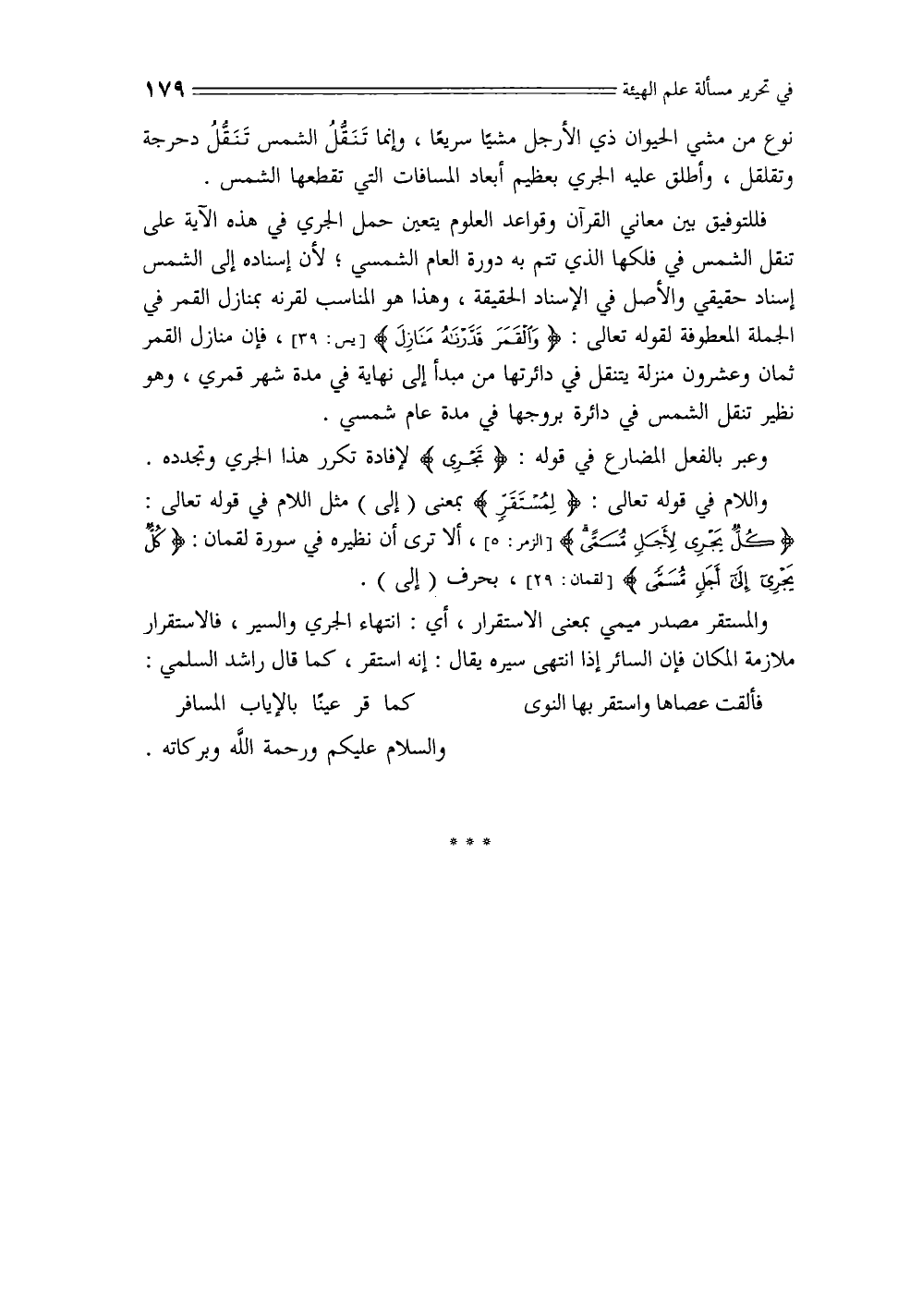 فللتوفيق بين معاني القرآن وقواعد العلوم يتعين حمل الجري في هذه الآية على تنقل الشمس في فلكها الذي تتم به دورة العام الشمسي؛ لأن إسناده إلى الشمس إسناد حقيقي والأصل في الإسناد الحقيقة، وهذا هو المناسب لقرنه بمنازل القمر في الجملة المعطوفة لقوله تعالى: {وَالْقَمَرَ قَدَّرْنَاهُ مَنَازِلَ} [يس: 39]، فإن منازل القمر ثمان وعشرون منزلة يتنقل في دائرتها من مبدأ إلى نهاية في مدة شهر قمري، وهو نظير تنقل الشمس في دائرة بروجها في مدة عام شمسي.