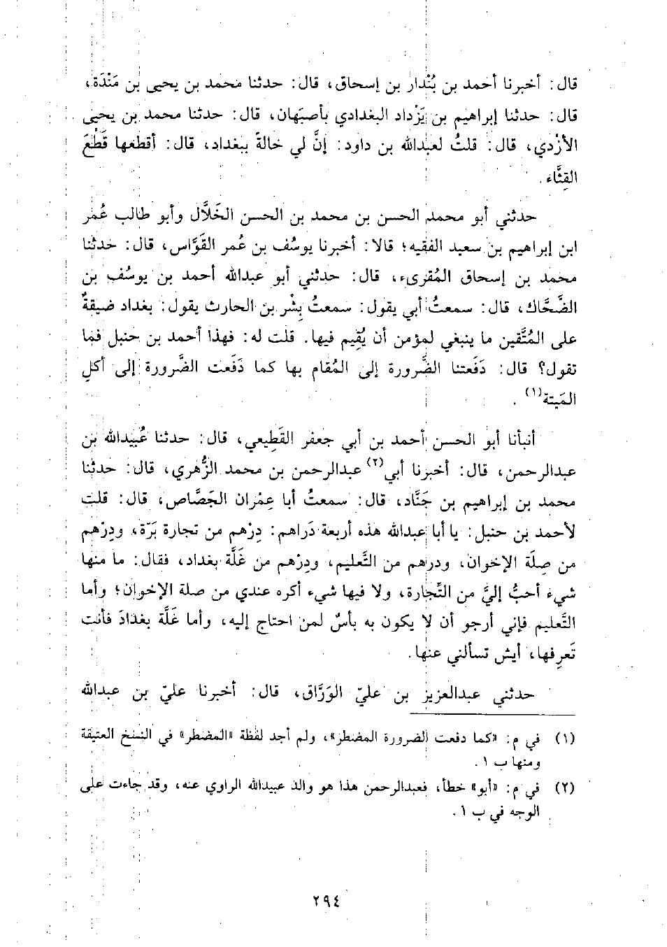 أَنْبَأَنَا أَبُو الْحَسَن أحمد بْن أَبِي جعفر القطيعي، قَالَ: حدثنا عبيد الله بْن عَبْد الرَّحْمَنِ، قَالَ: أخبرنا أبي عَبْد الرَّحْمَنِ بْن محمد الزهري، قَالَ: حدثنا محمد بْن إبراهيم بْن جناد، قَالَ: سمعت أبا عمران الجصاص، قَالَ: قلت لأحمد بْن حَنْبَل: " يا أبا عَبْد الله هذه أربعة دراهم: درهم من تجارة برة، ودرهم من صلة الإخوان، ودرهم من التعليم، ودرهم من غلة بغداد، فقال: ما منها شيء أحب إلي من التجارة، ولا فيها شيء أكره عندي من صلة الإخوان، وأما التعليم، فإني أرجو أن لا يكون به بأس لمن احتاج إليه، وأما غلة بغداد فأنت تعرفها، إيش تسألني عنها ".