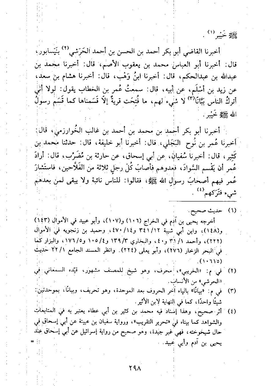 (4) -[1: 298] أَخْبَرَنَا الْقَاضِي أَبُو بَكْرٍ أَحْمَدُ بْنُ الْحَسَنِ بْنِ أَحْمَدَ الْحَرَشِيُّ، بِنَيْسَابُورَ، قَالَ: أَخْبَرَنَا أَبُو الْعَبَّاسِ مُحَمَّدُ بْنُ يَعْقُوبَ الأَصَمُّ، قَالَ: أَخْبَرَنَا مُحَمَّدُ بْنُ عَبْدِ اللَّهِ بْنِ عَبْدِ الْحَكَمِ، قَالَ: أَخْبَرَنَا ابْنُ وَهْبٍ، قَالَ: أَخْبَرَنَا هِشَامُ بْنُ سَعْدٍ، عَنْ زَيْدِ بْنِ أَسْلَمَ، عَنْ أَبِيهِ، قَالَ: سَمِعْتُ عُمَرَ بْنَ الْخَطَّابِ، يَقُولُ: " لَوْلا أَنِّي أَتْرُكُ النَّاسَ بَبَّانًا لا شَيْءَ لَهُمْ، مَا فَتَحْتُ قَرْيَةً إِلا قَسَمْنَاهَا كَمَا قَسَمَ رَسُولُ اللَّهِ صَلَّى اللَّهُ عَلَيْهِ وَسَلَّمَ خَيْبَرَ "