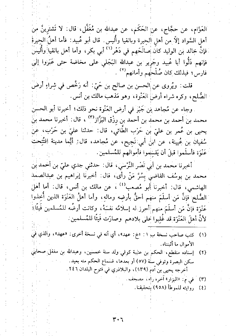 الْعَوَّامِ، عَنْ حَجَّاجٍ، عَنِ الْحَكَمِ، عَنْ عَبْدِ اللَّهِ بْنِ مُغَفَّلٍ، قَالَ: لا تَشْتَرِيَنَّ مِنْ أَهْلِ السَّوَادِ إِلا مِنْ أَهْلِ الْحِيرَةِ وَبَانِقْيَا وَأُلَيْسَ، قَالَ أَبُو عُبَيْدٍ: فَأَمَّا أَهْلُ الْحِيرَةِ فَإِنَّ خَالِدَ بْنَ الْوَلِيدِ كَانَ صَالَحَهُمْ فِي دَهْرِ أَبِي بَكْرٍ، وَأَمَّا أَهْلُ بَانِقْيَا وَأُلَيْسَ فَإِنَّهُمْ دَلُّوا أَبَا عُبَيْدٍ وَجَرِيرَ بْنَ عَبْدِ اللَّهِ الْبَجَلِيَّ عَلَى مَخَاضَةٍ حَتَّى عَبَرُوا إِلَى فَارِسَ، فَبِذَلِكَ كَانَ صُلْحُهُمْ وَأَمَانُهُمْ قلت: ويروى عَنِ الْحَسَن بْن صالح بْن حي: إنه رخص في شراء أرض الصلح وكره شراء أرض العنوة، وهو مذهب مالك بْن أنس.