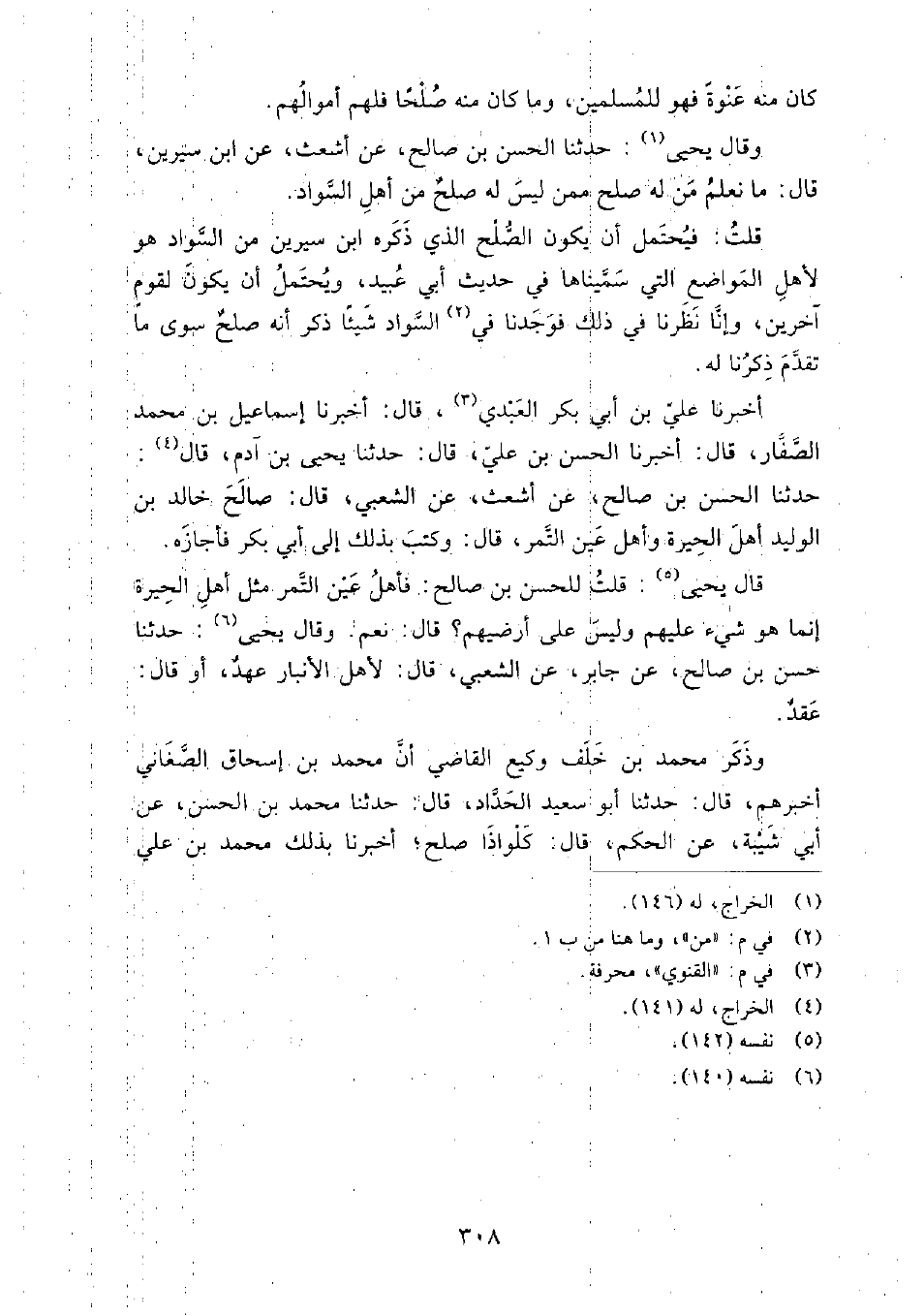(14) أَخْبَرَنَا عَلِيُّ بْنُ أَبِي بَكْرٍ الْعَبْدِيُّ، قَالَ: أَخْبَرَنَا إِسْمَاعِيلُ بْنُ مُحَمَّدٍ الصَّفَّارُ، قَالَ أخبرنا الْحَسَنُ بْنُ عَلِيٍّ، قَالَ: حدثنا يَحْيَى بْنُ آدَمَ، قَالَ: حدثنا الْحَسَنُ بْنُ صَالِحٍ، عَنْ أَشْعَثَ عَنِ الشَّعْبِيِّ، قَالَ: صَالَحَ خَالِدُ بْنُ الْوَلِيدِ: أَهْلَ الْحِيرَةِ وَأَهْلَ عَيْنِ التَّمْرِ، قَالَ: وَكَتَبَ بِذَلِكَ إِلَى أَبِي بَكْرٍ، فَأَجَازَهُ، قَالَ يَحْيَى: قُلْتُ لِلْحَسَنِ بْنِ صَالِحٍ: فَأَهْلُ عَيْنِ التَّمْرِ مِثْلُ أَهْلِ الْحِيرَةِ، إِنَّمَا هُوَ شَيْءٌ عَلَيْهِمْ، وَلَيْسَ عَلَى أَرَضِيهِمْ، قَالَ: نَعَمْ، وَقَالَ: يَحْيَى: حَدَّثَنَا حَسَنُ بْنُ صَالِحٍ، عَنْ جَابِرٍ، عَنِ الشَّعْبِيِّ، قَالَ: لأَهْلِ الأَنْبَارِ عَهْدٌ أَوْ قَالَ عَقْدٌ