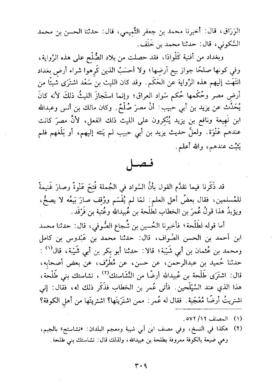 (15) فَأَخْبَرَنَا الْحُسَيْنُ بْنُ شُجَاعٍ الصُّوفِيُّ، قَالَ: حَدَّثَنَا مُحَمَّدُ بْنُ أَحْمَدَ بْنِ الْحَسَنِ الصَّوَّافُ، قَالَ: حَدَّثَنَا مُحَمَّدُ بْنُ عَبْدُوسِ بْنِ كَامِلٍ وَمُحَمَّدُ بْنُ عُثْمَانَ بْنِ أَبِي شَيْبَةَ، قَالا: حَدَّثَنَا أَبُو بَكْر بْنُ أَبِي شَيْبَةَ، قَالَ: حَدَّثَنَا حُمَيْدُ بْنُ عَبْدِ الرَّحْمَنِ، عَنْ حَسَنٍ، عَنْ مُطَرِّفٍ، عَنْ بَعْضِ أَصْحَابِهِ، قَالَ: اشْتَرَى طَلْحَةُ بْنُ عُبَيْدِ اللَّهِ أَرْضًا مِنَ النّشَاستك، نشَاستك بَنِي طَلْحَةَ، هَذَا الَّذِي عِنْدَ السَّيْلَحِينَ، فَأَتَى عُمَرَ بْنَ الْخَطَّابِ، فَذَكَرَ ذَلِكَ لَهُ، فَقَالَ: إِنِّي اشْتَرَيْتُ أَرْضًا مُعْجَبَةً، فَقَالَ لَهُ عُمَرُ: مِمَّنِ اشْتَرَيْتَهَا؟ اشْتَرَيْتُهَا مِنْ أَهْلِ الْكُوفَةِ،