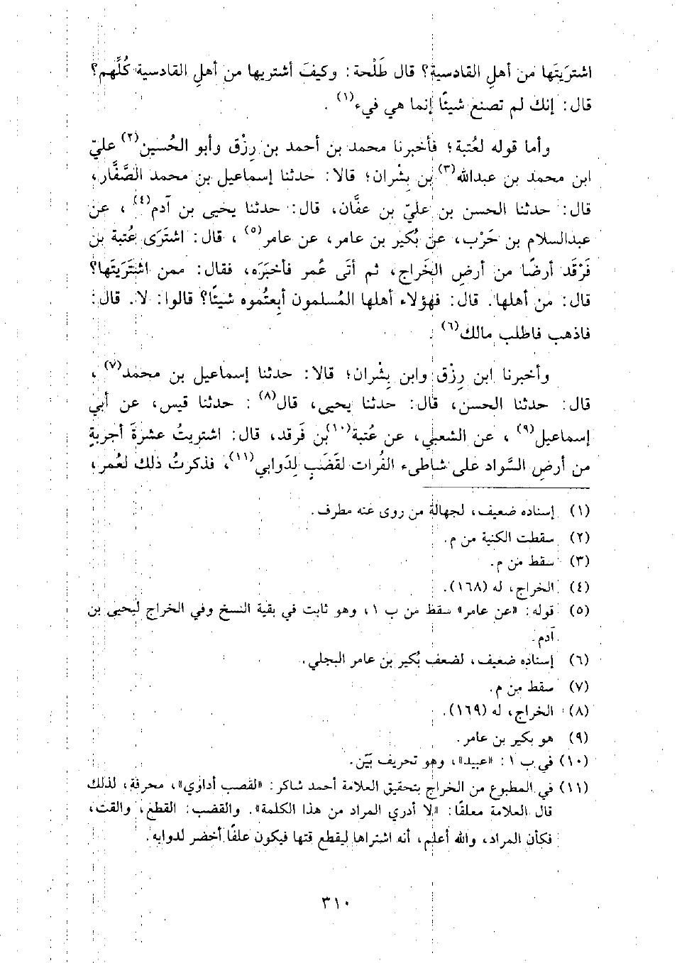 اشْتَرَيْتَهَا مِنْ أَهْلِ الْقَادِسِيَّةِ؟ قَالَ طَلْحَةُ: وَكَيْفَ أَشْتَرِيهَا مِنْ أَهْلِ الْقَادِسِيَّةِ كُلِّهِمْ؟ قَالَ: إِنَّكَ لَمْ تَصْنَعْ شَيْئًا إِنَّمَا هِيَ فَيْءٌ
