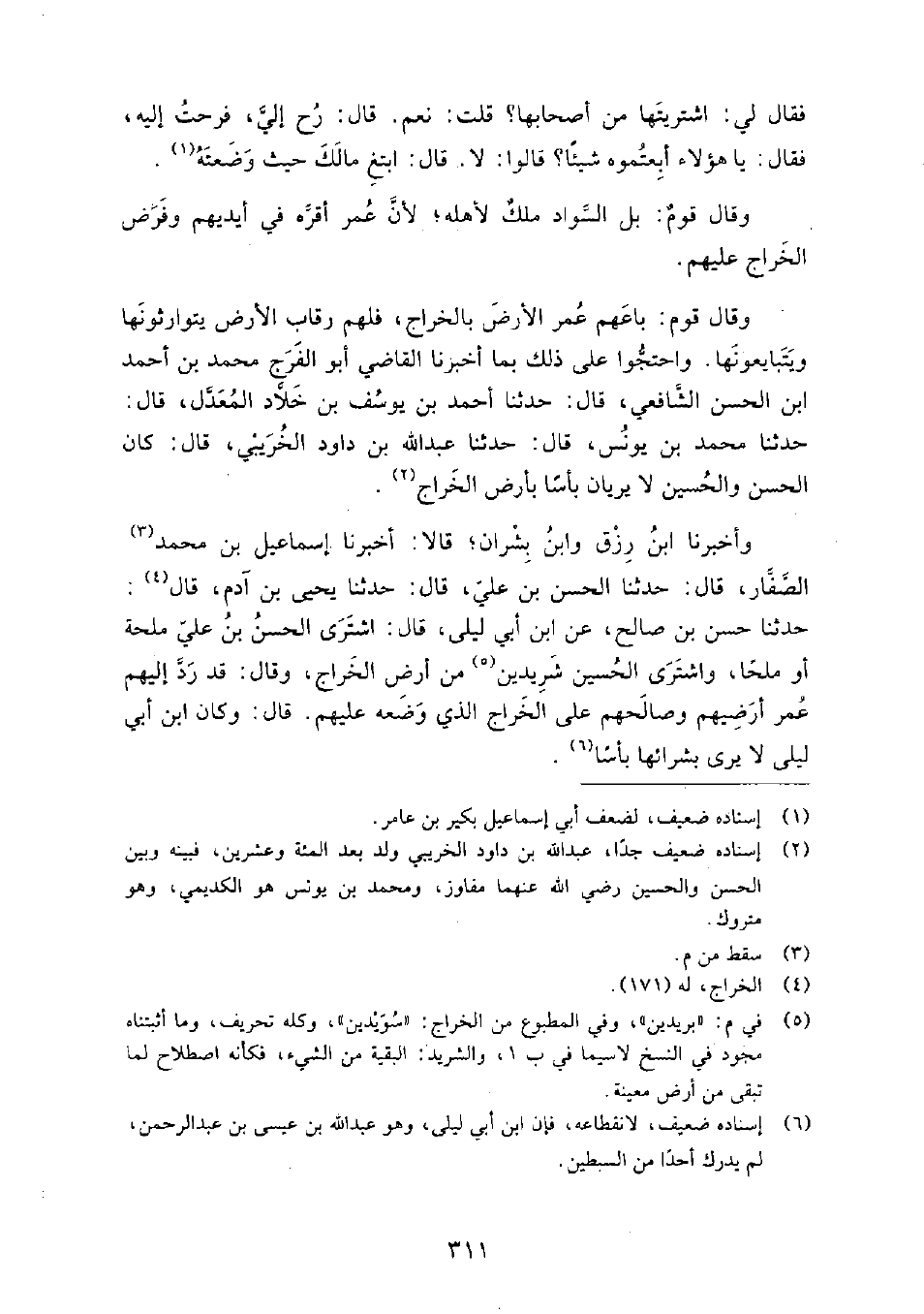 فَقَالَ لِي: اشْتَرَيْتَهَا مِنْ أَصْحَابِهَا؟ قُلْتُ: نَعَمْ، قَالَ: رُحْ إِلَيَّ، فَرُحْتُ إِلَيْهِ، فَقَالَ: يَا هَؤُلاءِ، أَبِعْتُمُوهُ شَيْئًا؟ قَالُوا: لا، قَالَ: ابْتَغِ مَالَكَ حَيْثُ وَضَعْتَهُ، وَقَالَ قَوْمٌ: بَلِ السَّوَادُ مِلْكٌ لأَهْلِهِ؛ لأَنَّ عُمَرُ أَقَرَّهُ فِي أَيْدِيهِمْ وَفَرَضَ الْخَرَاجَ عَلَيْهِمْ.