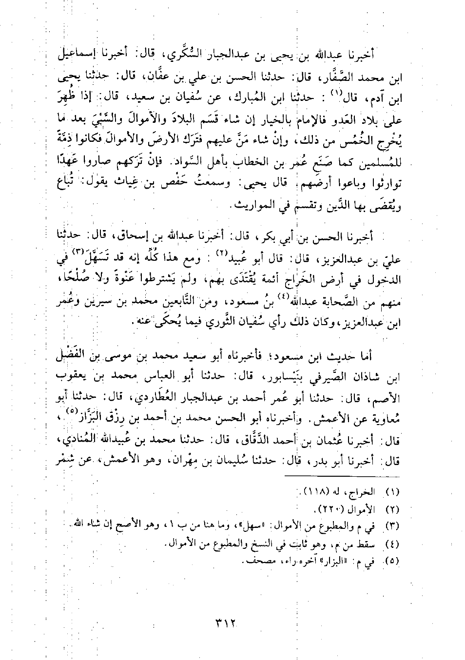 أَخْبَرَنَا الْحَسَن بْن أَبِي بكر، قَالَ: أَخْبَرَنَا عَبْدُ الله بْن إسحاق، قَالَ: حَدَّثَنَا عَلِيّ بْن عَبْد العزيز، قَالَ: قَالَ أَبُو عبيد: ومع هذا كله، إنه قد تسهل في الدخول، في أرض الخراج أئمة يقتدى بهم، ولم يشترطوا عنوة، ولا صلحا، منهم من الصحابة عبد الله بْن مسعود، ومن التابعين مُحَمَّد بْن سيرين، وعمر بْن عَبْد العزيز، وكان ذلك رأي سفيان الثوري، فيما يحكى عنه.
