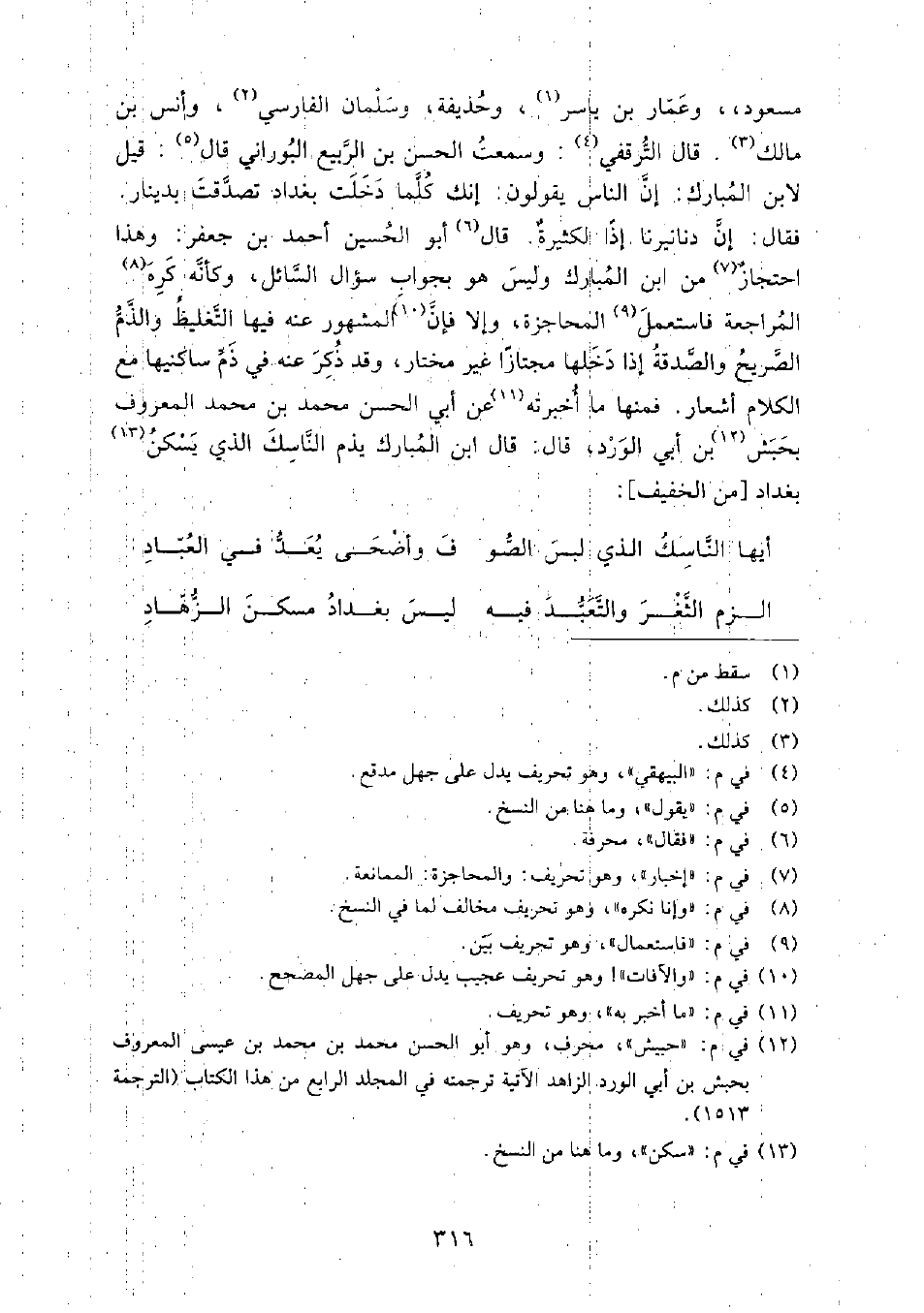 قَالَ أَبُو الحسين أَحْمَد بْن جعفر: وهذا احتجاز منِ ابْن المبارك وليس هو بجواب سؤال السائل، وكأنه كره المراجعة، فاستعمل المحاجزة، وإلا فإن المشهور عنه فيها التغليظ والذم الصريح، والصدقة إذا دخلها مجتازا غير مختار، وقد ذكر عنه في ذم ساكنيها، مع الكلام أشعار، فمنها ما أخبرته عَنْ أَبِي الْحَسَن مُحَمَّد بْن مُحَمَّد المعروف بِحبش بْن أَبِي الورد، قَالَ: قَالَ ابْن المبارك يذم الناسك الذي يسكن بغداد.