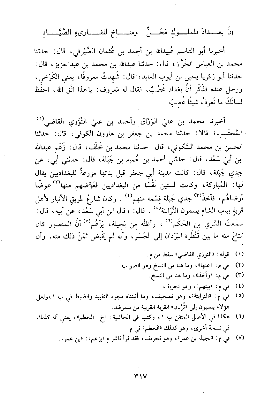 أَخْبَرَنَا مُحَمَّد بْن عَلِيّ الوراق، وأحمد بْن عَلِيّ التوزي القاضي المحتسب، قالا: حَدَّثَنَا مُحَمَّد بْن جعفر بْن هارون الكوفي، قَالَ: حَدَّثَنَا الْحَسَن بْن مُحَمَّد السكوني، قَالَ: حَدَّثَنَا مُحَمَّد بْن خلف، قَالَ: زعم عَبْد الله بْن أَبِي سعد، قَالَ: حَدَّثَنِي أَحْمَد بْن حميد بْن جبلة، قَالَ: حَدَّثَنِي أَبِي، عَنْ جدي جبلة قَالَ: كانت مدينة أَبِي جعفر قبل بنائها مزرعة للبغداديين، يقال لها: المباركة، وكانت لستين نفسا من البغداديين، فعوضهم منها عوضا أرضاهم، فأخذ جدي جبلة قسمه منهم، وكان شارع طريق الأنبار لأهل قرية بباب الشام يسمون الترابنة.