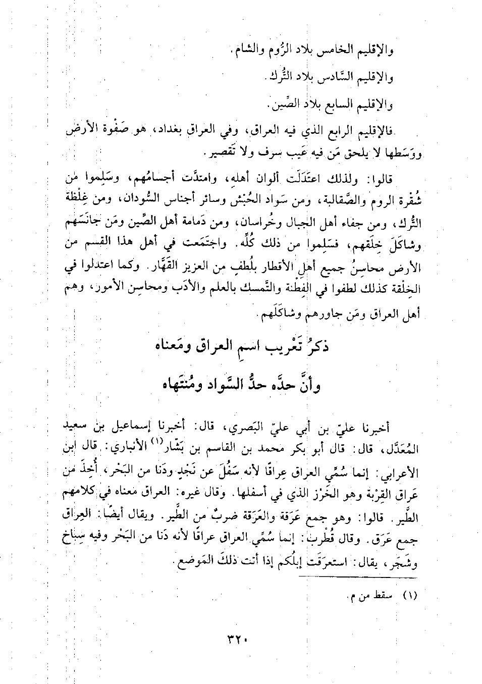 واجتمعت في أهل هذا القسم من الأرض محاسن جميع أهل الأقطار بلطف من العزيز القهار، وكما اعتدلوا في الخلقة كذلك لطفوا في الفطنة والتمسك بالعلم والأدب ومحاسن الأمور، وهم أهل العراق ومن جاورهم وشاكلهم.