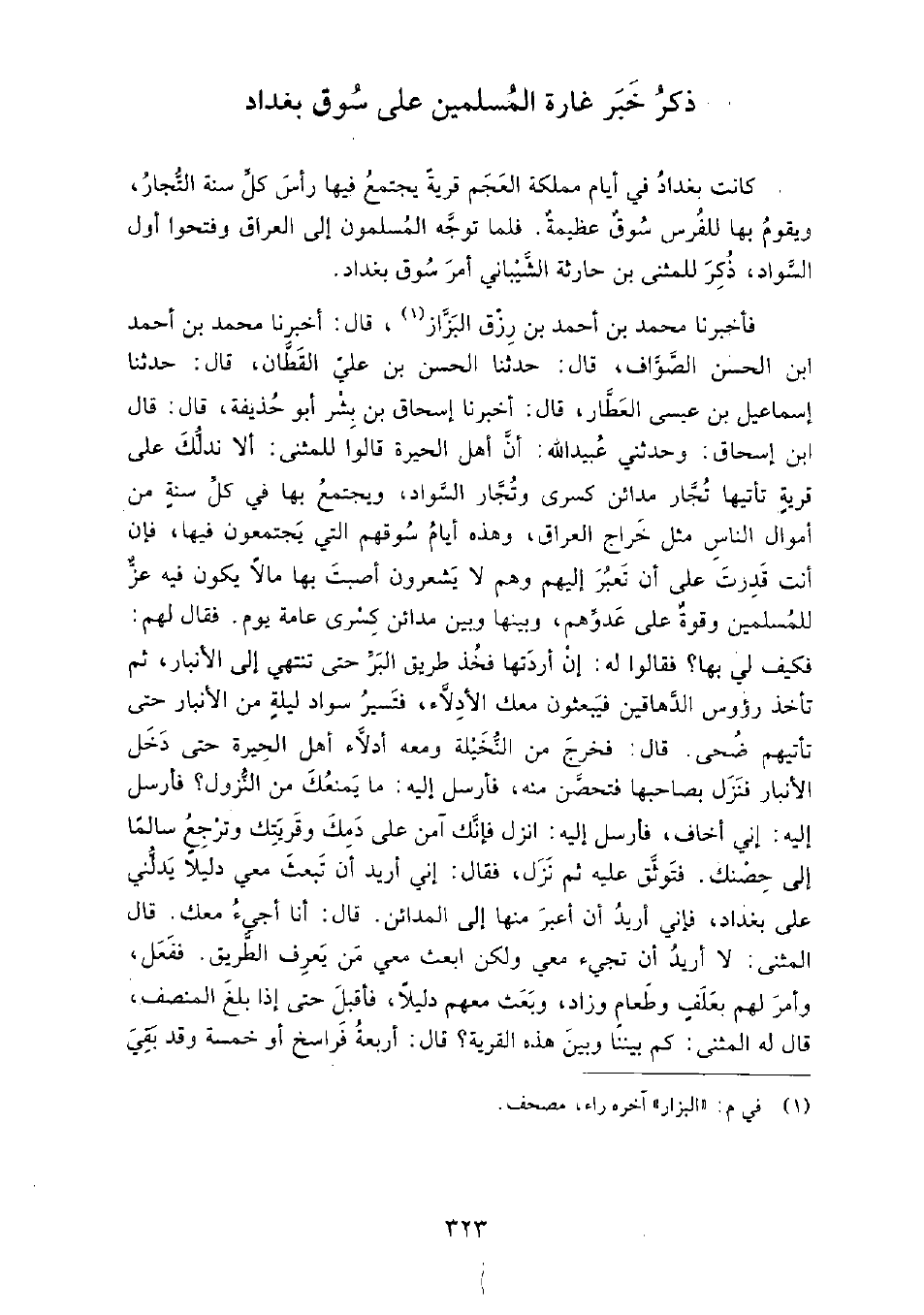 ذكر خبر غارة المسلمين على سوق بغداد كانت بغداد في أيام مملكة العجم قرية يجتمع فيها رأس كل سنة التجار، ويقوم بها للفرس سوق عظيمة.