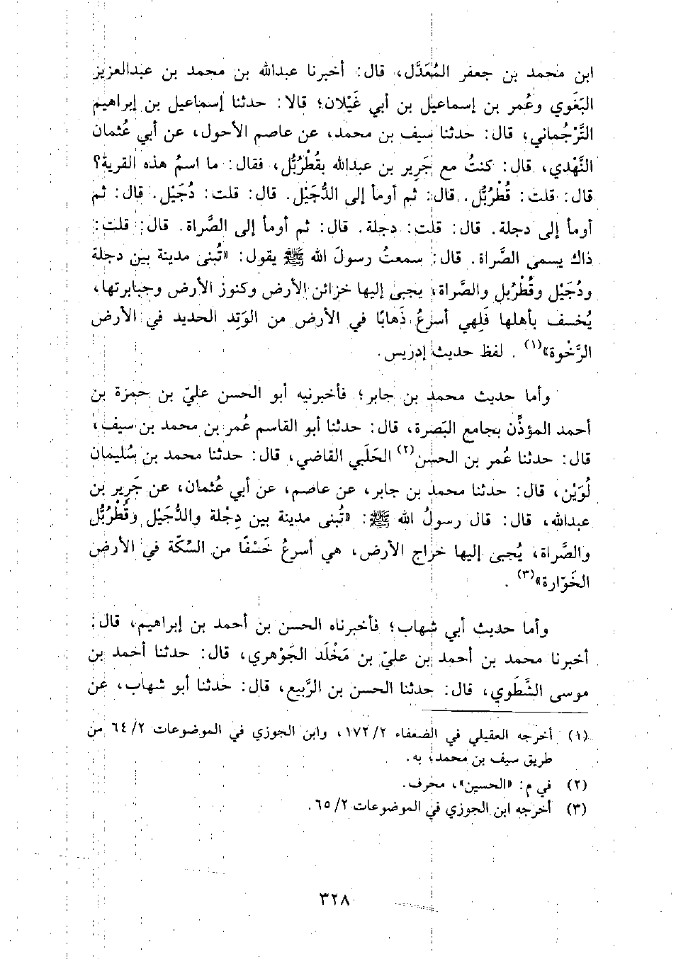 (31) -[1: 328] وَأَمَّا حَدِيثُ مُحَمَّدِ بْنِ جَابِرٍ، فَأَخْبَرَنِيهِ أَبُو الْحَسَنِ عَلِيُّ بْنُ حَمْزَةَ بْنِ أَحْمَدَ الْمُؤَذِّنُ بِجَامِعِ الْبَصْرَةِ، قَالَ: حَدَّثَنَا أَبُو الْقَاسِمِ عُمَرُ بْنُ مُحَمَّدِ بْنِ سَيْفٍ، قَالَ: حَدَّثَنَا عُمَرُ بْنُ الْحَسَنِ الْحَلَبِيُّ الْقَاضِي، قَالَ: حَدَّثَنَا مُحَمَّدُ بْنُ سُلَيْمَانَ لُوَيْنٌ، قَالَ: حَدَّثَنَا مُحَمَّدُ بْنُ جَابِرٍ، عَنْ عَاصِمٍ، عَنْ أَبِي عُثْمَانَ، عَنْ جَرِيرِ بْنِ عَبْدِ اللَّهِ، قَالَ: قَالَ رَسُولُ اللَّهِ صَلَّى اللَّهُ عَلَيْهِ وَسَلَّمَ: " تُبْنَى مَدِينَةٌ بَيْنَ دِجْلَةَ وَالدُّجَيْلِ وَقُطْرُبُّلَ وَالصَّرَاةِ يُجْبَى إِلَيْهَا خَرَاجُ الأَرْضِ، هِيَ أَسْرَعُ خَسْفًا مِنَ السَّكَّةِ فِي الأَرْضِ الْخَوَّارَةِ "