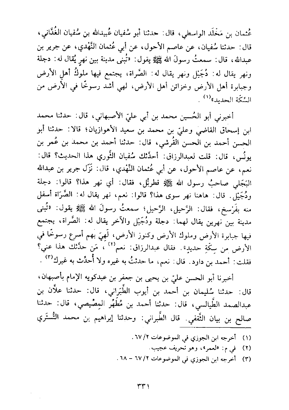 (38) -[1: 331] أَخْبَرَنِي أَبُو الْحُسَيْنِ مُحَمَّدُ بْنُ أَبِي عَلِيٍّ الأَصْبَهَانِيُّ، قَالَ: حَدَّثَنَا مُحَمَّدُ بْنُ إِسْحَاقَ الْقَاضِي وَعَلِيُّ بْنُ مُحَمَّدِ بْنِ سَعِيدٍ الأَهْوَازِيَّانِ، قَالا: حَدَّثَنَا أَبُو الْحَسَنِ أَحْمَدُ بْنُ الْحَسَنِ الْقُرَشِيُّ، قَالَ: حَدَّثَنَا أَحْمَدُ بْنُ مُحَمَّدِ بْنِ عُمَرَ بْنِ يُونُسَ، قَالَ: قُلْتُ لِعَبْدِ الرَّزَّاقِ: أَحَدَّثَكَ سُفْيَانَ الثَّوْرِيِّ هَذَا الْحَدِيثَ؟ قَالَ: نَعَمْ، عَنْ عَاصِمٍ الأَحْوَلِ، عَنْ أَبِي عُثْمَانَ النَّهْدِيِّ، قَالَ: نَزَلَ جَرِيرُ بْنُ عَبْدِ اللَّهِ الْبَجَلِيُّ صَاحِبُ رَسُولِ اللَّهِ صَلَّى اللَّهُ عَلَيْهِ وَسَلَّمَ قُطْرُبُّلَ، فَقَالَ: أَيُّ نَهْرٍ هَذَا؟ قَالُوا: دِجْلَةُ وَدُجَيْلٌ، قَالَ: هَا هُنَا نَهْرٌ سِوَى هَذَا؟ قَالُوا: نَعَمْ، نَهْرٌ يُقَالُ لَهُ: الصَّرَاةُ أَسْفَلَ مِنْهُ بِفَرْسَخٍ، فَقَالَ: الرَّحِيلَ، الرَّحِيلَ سَمِعْتُ رَسُولَ اللَّهِ صَلَّى اللَّهُ عَلَيْهِ وَسَلَّمَ يَقُولُ: " تُبْنَى مَدِينَةٌ بَيْنَ نَهْرَيْنِ يُقَالُ لَهُمَا: دِجْلَةُ وَدُجَيْلٌ وَالآخَرُ، يُقَالُ لَهُ: الصَّرَاةُ، يَجْتَمِعُ فِيهَا جَبَابِرَةُ الأَرْضِ وَمُلُوكُ الأَرْضِ وَكُنُوزُ الأَرْضِ، لَهِيَ بِهِمْ أَسْرَعُ رُسُوخًا فِي الأَرْضِ مِنْ سِكَّةِ حَدِيدٍ "، فَقَالَ عَبْدُ الرَّزَّاقِ لِعُمَرَ: نَعَمْ، مَنْ حَدَّثَكَ هَذَا عَنِّي؟ فَقُلْتُ: أَحْمَدُ بْنُ دَاوُدَ، قَالَ: نَعَمْ، مَا حُدِّثْتَ بِهِ غَيْرَهُ وَلا أُحَدِّثُ بِهِ غَيْرَكَ "