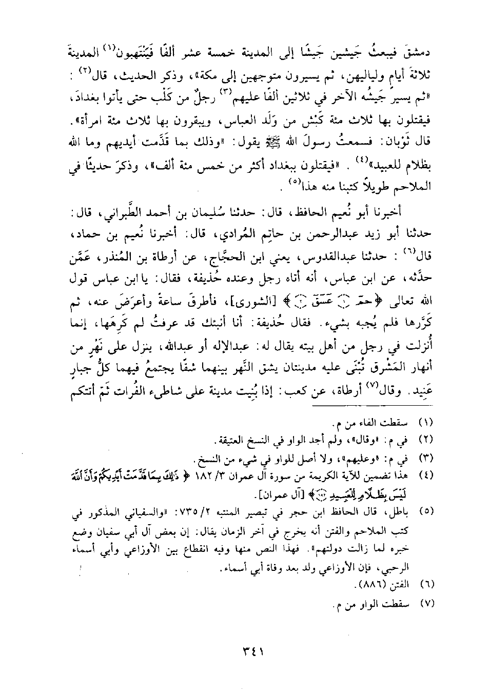 دِمَشْقَ، فَيَبْعَثُ جَيْشَيْنِ جَيْشًا إِلَى الْمَدِينَةِ خَمْسَةَ عَشْرَ أَلْفًا، فَيَنْتَهِبُونَ الْمَدِينَةَ ثَلاثَةَ أَيَّامٍ وَلَيَالِيَهُنَّ، ثُمَّ يَسِيرُونَ مُتَوَجِّهِينَ إِلَى مَكَّةَ "، وَذَكَرَ الْحَدِيثَ، وَقَالَ: " ثُمَّ يَسِيرُ جَيْشُهُ الآخَرُ فِي ثَلاثِينَ أَلْفًا عَلَيْهِمْ رَجُلٌ مِنْ كَلْبٍ حَتَّى يَأْتُوا بَغْدَادَ، فَيَقْتُلُونَ بِهَا ثَلاثَ مِائَةِ كَبْشٍ مِنْ وَلَدِ الْعَبَّاسِ، وَيَبْقُرُونَ بِهَا ثَلاثَ مِائَةِ امْرَأَةٍ ".