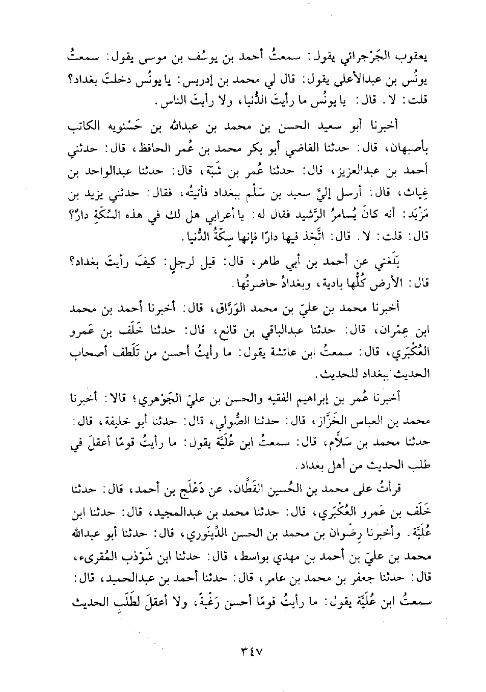 يعقوب الجرجرائي، يقول: سمعت أَحْمَد بْن يوسف بْن موسى، يقول: سمعت يونس بْن عَبْد الأعلى، يقول: قَالَ لي مُحَمَّد بْن إدريس: يا يونس دخلت بغداد؟ قلت: لا.