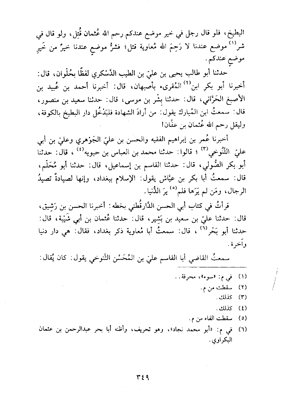 حَدَّثَنَا أَبُو طالب يَحْيَى بْن عَلِيّ بْن الطيب الدسكري، لفظا بحلوان، قَالَ: أَخبرنا أَبُو بكر ابن المقرئ، بأصبهان، قَالَ: أَخبرنا أَحْمَد بْن عبيد بْن الأصبغ الحراني، قَالَ: حَدَّثَنَا بشر بْن مُوسَى، قَالَ: حَدَّثَنَا سعيد بْن منصور، قَالَ: سمعت ابن المبارك، يقول: من أراد الشهادة فليدخل دار البطيخ بالكوفة، وليقل رحم الله عثمان بْن عفان! أَخْبَرَنَا عُمَر بْن إِبْرَاهِيمَ الفقيه، والحسن بْن عَلِيّ الجوهري، وعلي بْن أَبِي عَلِيّ التنوخي، قالوا: حَدَّثَنَا مُحَمَّد بْن العباس بْن حيويه، قَالَ: حَدَّثَنَا أَبُو بكر الصولي، قَالَ: حَدَّثَنَا القاسم بْن إسماعيل، قَالَ: حَدَّثَنَا أَبُو محلم، قَالَ: سمعت أبا بكر بْن عياش، يقول: الإسلام ببغداد، وإنها لصيادة تصيد الرجال، ومن لم يرها فلم ير الدنيا.