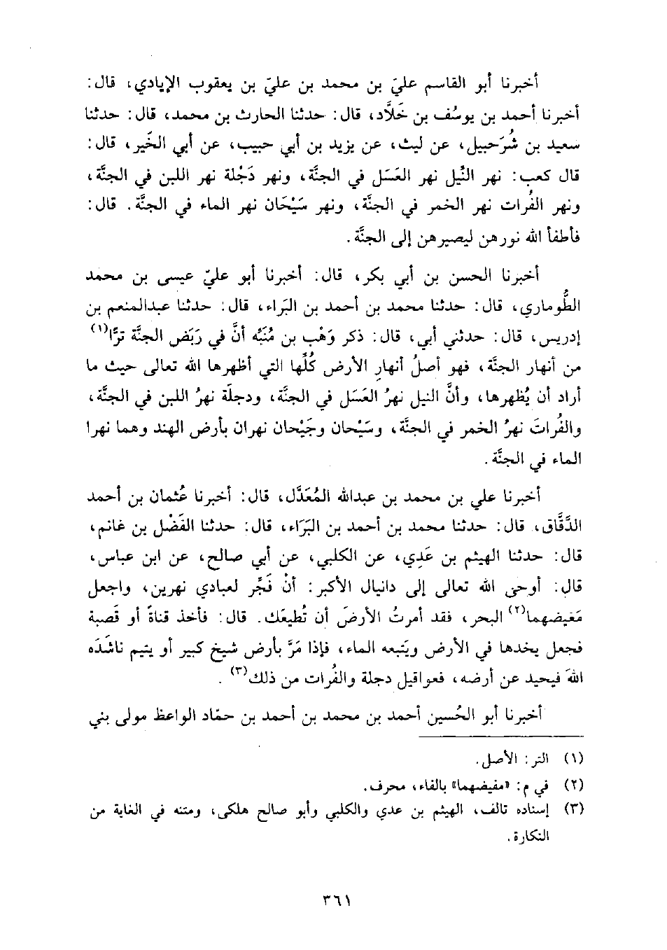 (53) أَخْبَرَنَا أَبُو الْقَاسِمِ عَلِيُّ بْنُ مُحَمَّدِ بْنِ عَلِيِّ بْنِ يَعْقُوبَ الإِيَادِيُّ، قَالَ: أَخْبَرَنَا أَحْمَدُ بْنُ يُوسُفَ بْنِ خَلادٍ، قَالَ: حَدَّثَنَا الْحَارِثُ بْنُ مُحَمَّدٍ، قَالَ: حَدَّثَنَا سَعِيدُ بْنُ شُرَحْبِيلَ، عَنْ لَيْثٍ، عَنْ يَزِيدَ بْنِ أَبِي حَبِيبٍ، عَنْ أَبِي الْخَيْرِ، قَالَ: قَالَ كَعْبٌ: " نَهْرُ النِّيلِ: نَهْرُ الْعَسَلِ فِي الْجَنَّةِ، وَنَهْرُ دِجْلَةَ: نَهْرُ اللَّبَنِ فِي الْجَنَّةِ، وَنَهْرُ الْفُرَاتِ: نَهْرُ الْخَمْرِ فِي الْجَنَّةِ، وَنَهْرُ سَيْحَانَ: نَهْرُ الْمَاءِ فِي الْجَنَّةِ، قَالَ: فَأَطْفَأَ اللَّهُ نُورَهُنَّ لِيُصَيِّرَهُنَّ إِلَى الْجَنَّةِ أَخْبَرَنَا الْحَسَنُ بْنُ أَبِي بَكْرٍ، قَالَ: أَخْبَرَنَا أَبُو عَلِيٍّ عِيسَى بْن مُحَمَّد الطوماري، قَالَ: حَدَّثَنَا مُحَمَّد بْن أَحْمَد بْن البراء، قَالَ: حَدَّثَنَا عَبْد المنعم بْن إدريس، قَالَ: حَدَّثَنِي أَبِي، قَالَ: ذكر وهب بْن منبه أن في ربض الجنة ترّا من أنهار الجنة، فهو أصل أنهار الأرض كلها التي أظهرها الله تعالى حيث ما أراد أن يظهرها، وأن النيل نهر العسل في الجنة، ودجلة نهر اللبن في الجنة، والفرات نهر الخمر في الجنة، وسيحان وجيحان نهران بأرض الهند، وهما نهرا الماء في الجنة.