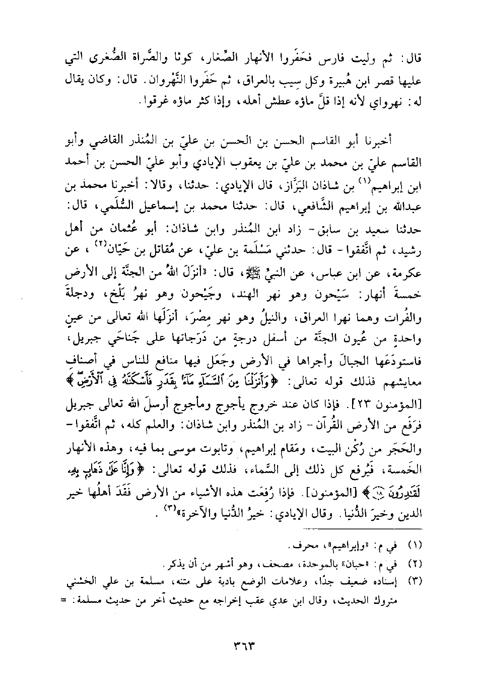 (55) -[1: 363] أَخْبَرَنَا أَبُو الْقَاسِمِ الْحَسَنُ بْنُ الْحَسَنِ بْنِ عَلِيِّ بْنِ الْمُنْذِرِ الْقَاضِي وَأَبُو الْقَاسِمِ عَلِيُّ بْنُ مُحَمَّدِ بْنِ عَلِيِّ بْنِ يَعْقُوبَ الإِيَادِيُّ وَأَبُو عَلِيٍّ الْحَسَنُ بْنُ أَحْمَدَ بْنِ إِبْرَاهِيمَ بْنِ شَاذَانَ الْبَزَّازُ، قَالَ الإِيَادِيُّ: حَدَّثَنَا، وَقَالا: أَخْبَرَنَا مُحَمَّدُ بْنُ عَبْدِ اللَّهِ بْنِ إِبْرَاهِيمَ الشَّافِعِيُّ، قَالَ: حَدَّثَنَا مُحَمَّدُ بْنُ إِسْمَاعِيلَ السَّلْمِيُّ، قَالَ: حَدَّثَنَا سَعِيدُ بْنُ سَابِقٍ، زَادَ ابْنُ الْمُنْذِرِ، وَابْنُ شَاذَانَ: أَبُو عُثْمَانَ مِنْ أَهْلِ رَشِيدٍ، ثُمَّ اتَّفَقُوا قَالَ: حَدَّثَنِي مَسْلَمَةُ بْنُ عَلِيٍّ، عَنْ مُقَاتِلِ بْنِ حَيَّانَ، عَنْ عِكْرِمَةَ، عَنِ ابْنِ عَبَّاسٍ، عَنِ النَّبِيِّ صَلَّى اللَّهُ عَلَيْهِ وَسَلَّمَ قَالَ: " أَنْزَلَ اللَّهُ مِنَ الْجَنَّةِ إِلَى الأَرْضِ خَمْسَةَ أَنْهَارٍ: سَيْحُونَ، وَهُوَ نَهْرُ الْهِنْدِ، وَجَيْحُونَ وَهُوَ نَهْرُ بَلْخٍ، وَدِجْلَةَ وَالْفُرَاتَ وَهُمَا نَهَرَا الْعِرَاقِ، وَالنِّيلَ وَهُوَ نَهْرُ مِصْرَ، أَنْزَلَهَا اللَّهُ تَعَالَى مِنْ عَيْنٍ وَاحِدَةٍ مِنْ عُيُونِ الْجَنَّةِ مِنْ أَسْفَلِ دَرَجَةٍ مِنْ دَرَجَاتِهَا عَلَى جَنَاحَيْ جِبْرِيلَ، فَاسْتَوْدَعَهَا الْجِبَالَ وَأَجْرَاهَا فِي الأَرْضِ، وَجَعَلَ فِيهَا مَنَافِعَ لِلنَّاسِ فِي أَصْنَافِ مَعَايِشِهِمْ، فَذَلِكَ قَوْلُهُ تَعَالَى: {وَأَنْزَلْنَا مِنَ السَّمَاءِ مَاءً بِقَدَرٍ فَأَسْكَنَّاهُ فِي الأَرْضِ}، فَإِذَا كَانَ عِنْدَ خُرُوجِ يَأْجُوجَ وَمَأْجُوجَ أَرْسَلَ اللَّهُ تَعَالَى جِبْرِيلَ، فَرَفَعَ مِنَ الأَرْضِ الْقُرْآنَ، زَادَ ابْنُ الْمُنْذِرِ وَابْنُ شَاذَانَ: وَالْعِلْمَ كُلَّهُ، ثُمَّ اتَّفَقُوا وَالْحَجَرَ مِنْ رُكْنِ الْبَيْتِ، وَمَقَامَ إِبْرَاهِيمَ، وَتَابُوتَ مُوسَى بِمَا فِيهِ، وَهَذِهِ الأَنْهَارَ الْخَمْسَةَ، فَيَرْفَعُ كُلَّ ذَلِكَ إِلَى السَّمَاءِ، فَذَلِكَ قَوْلُهُ تَعَالَى: {وَإِنَّا عَلَى ذَهَابٍ بِهِ لَقَادِرُونَ}.