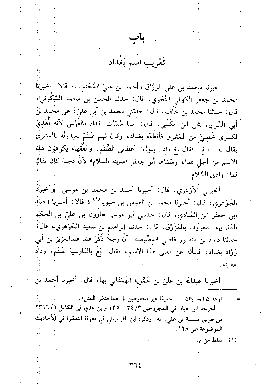 أَخْبَرَنَا مُحَمَّد بْن عَلِيّ الوراق، وأحمد بْن عَلِيّ المحتسب، قالا: أَخْبَرَنَا مُحَمَّد بْن جعفر الكوفي النحوي، قَالَ: حَدَّثَنَا الْحَسَن بْن مُحَمَّد السكوني، قَالَ: حَدَّثَنَا مُحَمَّد بْن خلف، قَالَ: حَدَّثَنِي مُحَمَّد بْن أَبِي عَلِيّ، عَنْ مُحَمَّد بْن أَبِي السري، عَنِ ابْن الكلبي، قَالَ: إنما سميت بغداد بالفرس؛ لأنه أهدي لكسرى خصي من المشرق، فأقطعه بغداد، وكان لهم صنم يعبدونه بالمشرق، يقال له: البغ، فقال: بغ داد.