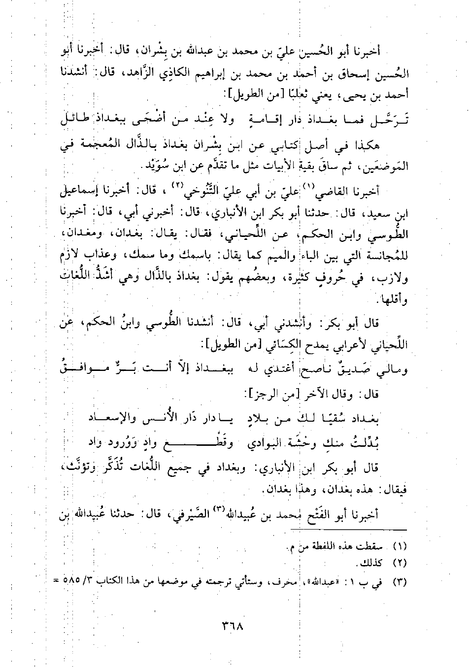 هكذا في أصل كتابي عَنِ ابْن بشران، بغداذ بالذال المعجمة في الموضعين، ثم ساق بقية الأبيات مثل ما تقدم عَنِ ابْن سويد.