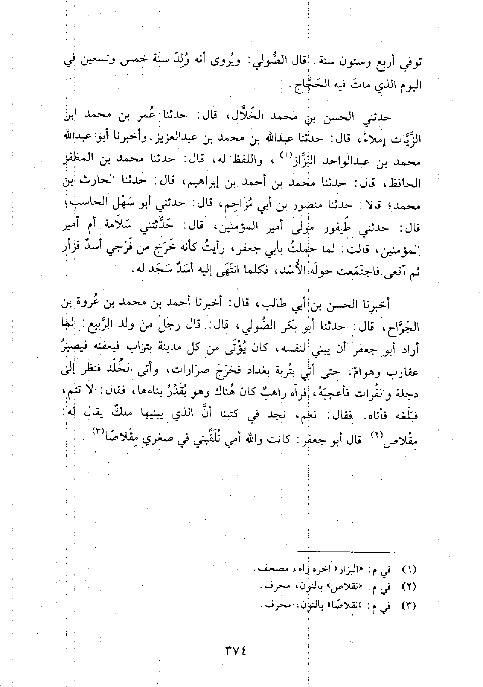 حَدَّثَنِي الْحَسَن بْن مُحَمَّد الخلال، قَالَ: حدثنا عُمَر بْن مُحَمَّد ابن الزيات إملاء، قَالَ: حَدَّثَنَا عَبْد الله بْن مُحَمَّد بْن عَبْد العزيز.