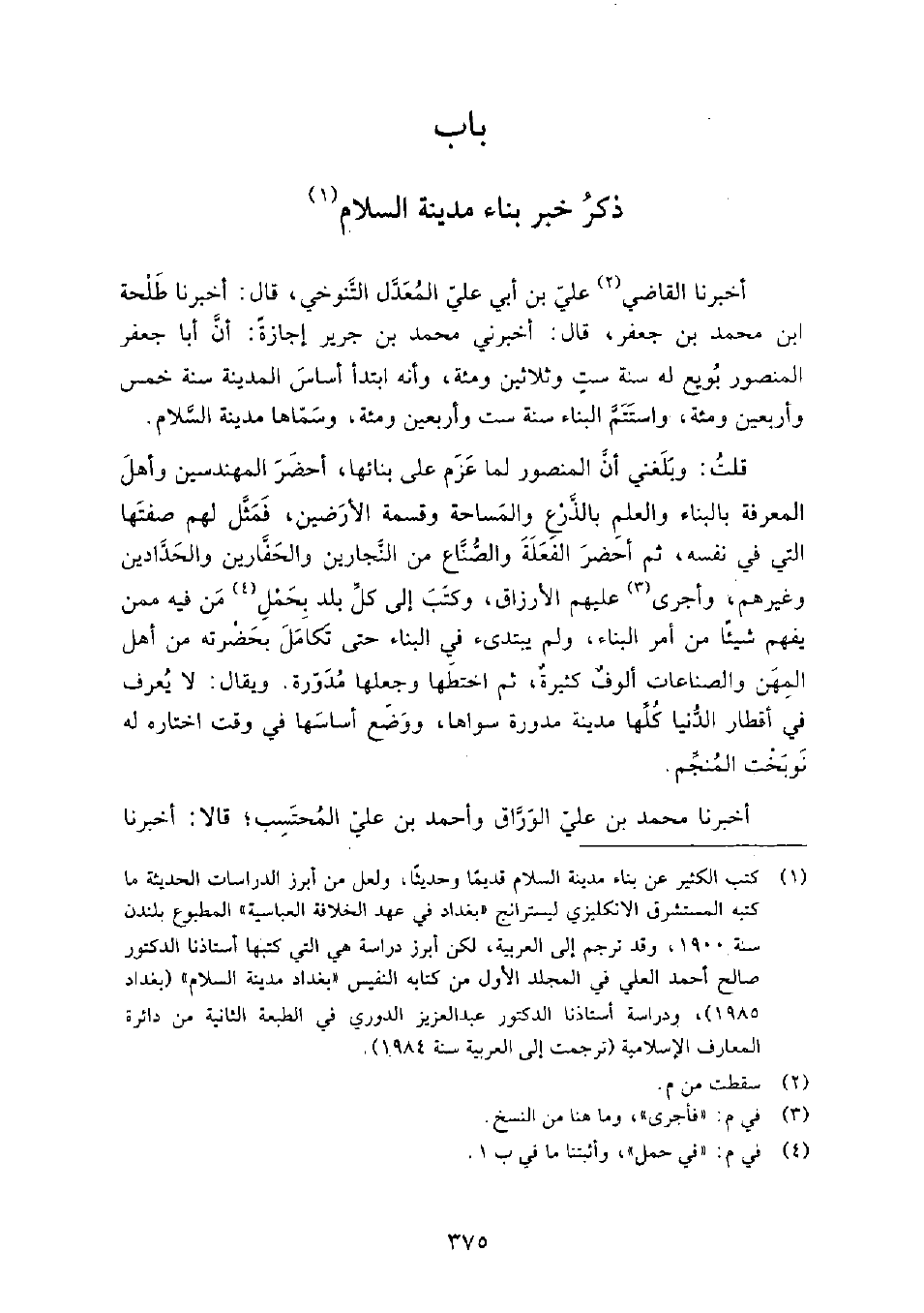 أَخْبَرَنَا عَلِيّ بْن أَبِي عَلِيّ المعدل التنوخي، قَالَ: أَخبرنا طلحة بْن مُحَمَّد بْنُ جَعْفَرٍ، قَالَ: أَخْبَرَنِي مُحَمَّد بْن جرير إجازة: أن أبا جعفر المنصور بويع له سنة ست وثلاثين ومائة، وأنه ابتدأ أساس المدينة سنة خمس وأربعين ومائة، واستتم البناء سنة ست وأربعين ومائة وسماها مدينة السلام.