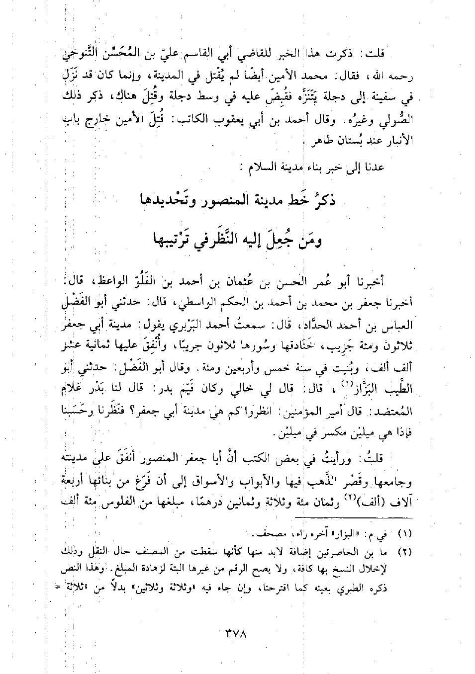 أَخْبَرَنَا أَبُو عُمَر الْحَسَن بْن عثمان بْن أَحْمَد بْن الفلو الواعظ، قَالَ: أَنْبَأَنَا جعفر بْن مُحَمَّد بْن أَحْمَد بْن الحكم الواسطي، قَالَ: حَدَّثَنِي أَبُو الفضل العباس بْن أَحْمَد الحداد، قَالَ: سمعت أَحْمَد بْن البربري، يقول: مدينة أبي جعفر ثلاثون ومائة جريب، خنادقها وسورها ثلاثون جريبا، وأنفق عليها ثمانية عشر ألف ألف، وبنيت في سنة خمس وأربعين ومائة.