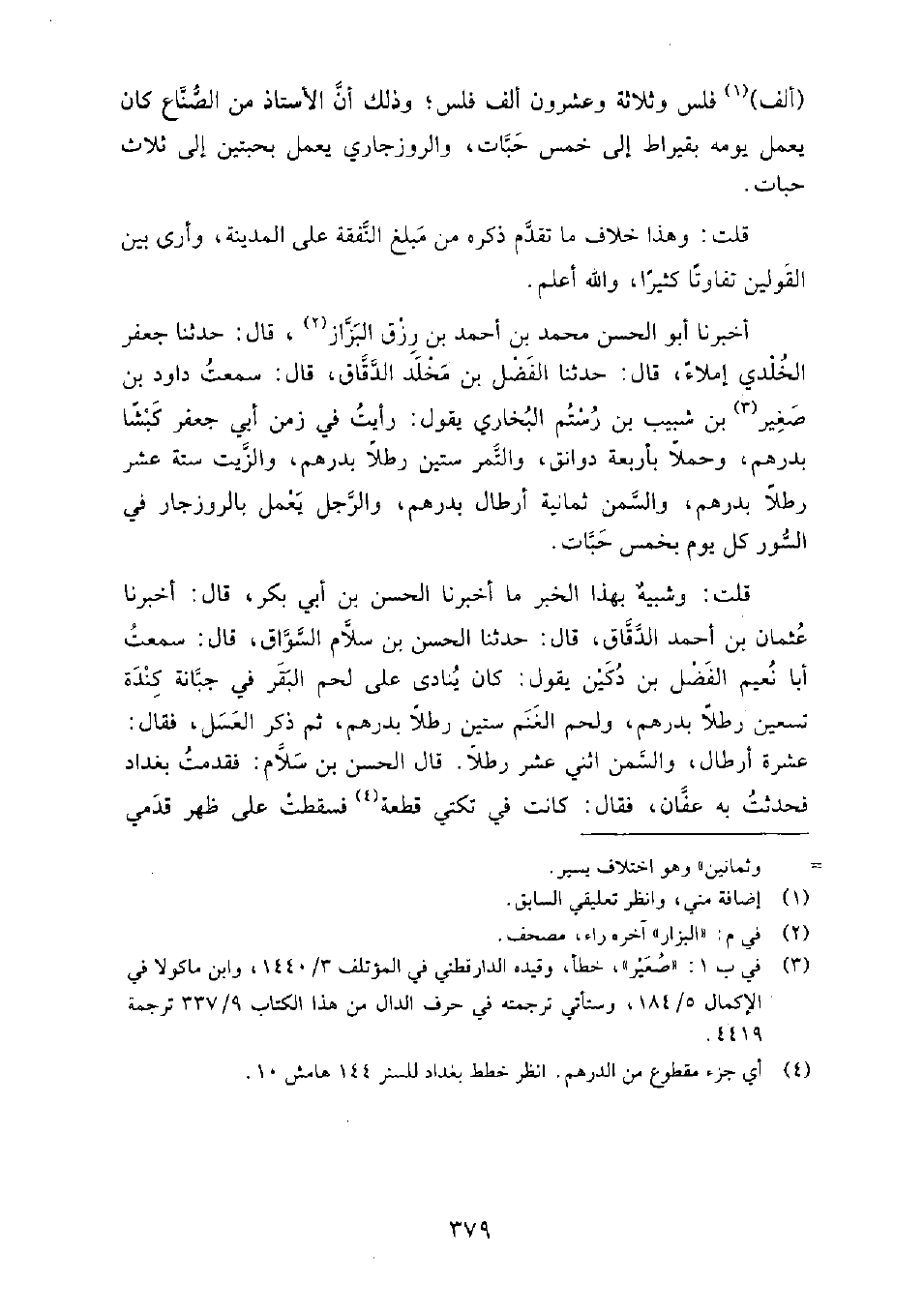 ألف فلس وثلاثة وعشرون ألف فلس، وذلك أن الأستاذ من الصناع كان يعمل يومه بقيراط إِلَى خمس حبات، والروزجاري يعمل بحبتين إِلَى ثلاث حبات.