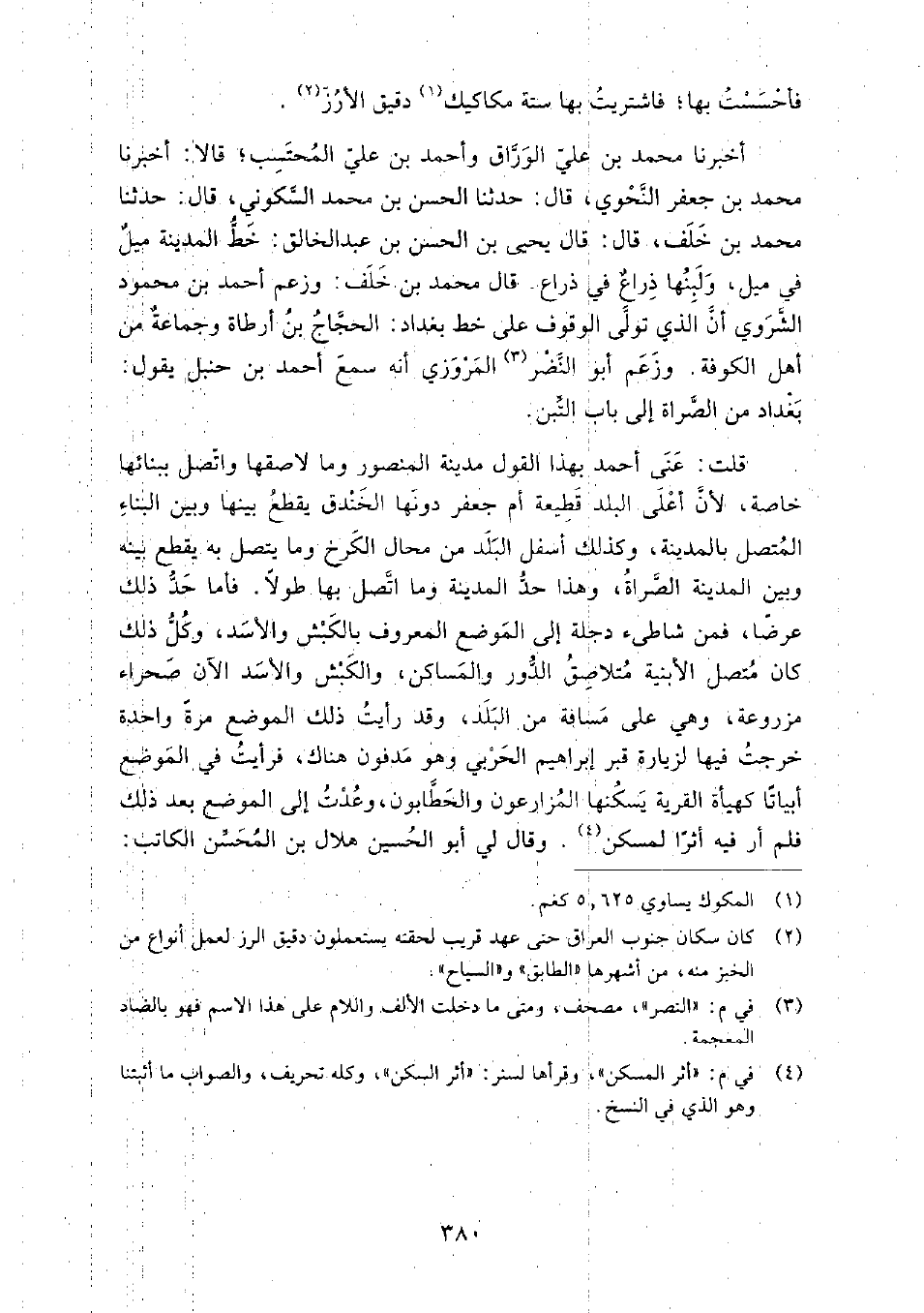 قلت: عنى أَحْمَد بهذا القول مدينة المنصور وما لاصقها واتصل ببنائها خاصة؛ لأن أعلى البلد قطيعة أم جعفر دونها الخندق يقطع بينها وبين البناء المتصل بالمدينة، وكذلك أسفل البلد من محال الكرخ وما يتصل به يقطع بينه وبين المدينة الصراة، وهذا حد المدينة وما اتصل بها طولا.