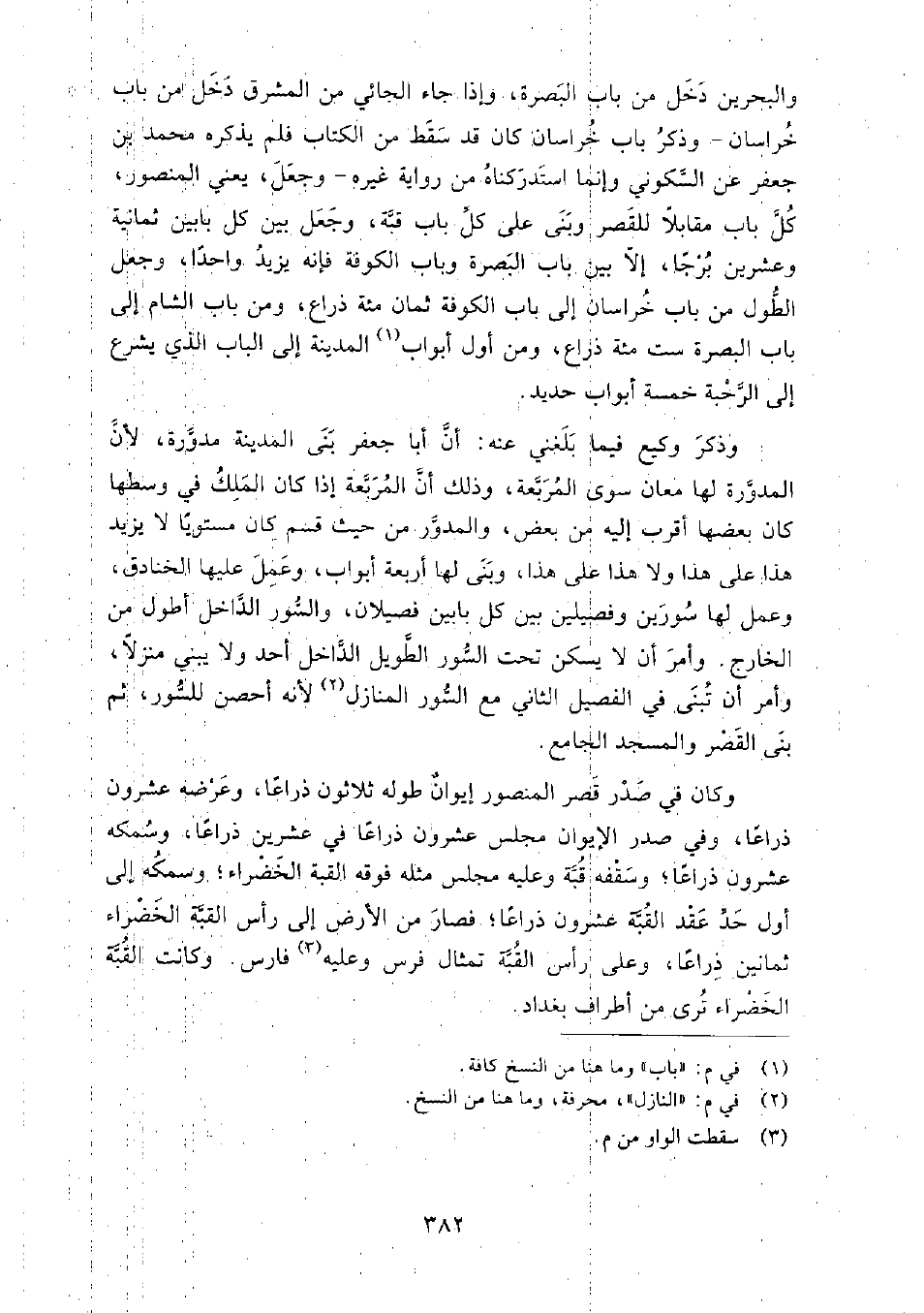 وذكر وكيع فيما بلغني عنه: أن أبا جعفر بنى المدينة مدورة؛ لأن المدورة لها معان سوى المربعة، وذلك أن المربعة إذا كان الملك في وسطها كان بعضها أقرب إليه من بعض، والمدور من حيث قسم كان مستويا لا يزيد هذا على هذا ولا هذا على هذا، وبنى لها أربعة أبواب، وعمل عليها الخنادق، وعمل لها سورين وفصيلين بين كل بابين فصيلان، والسور الداخل أطول من الخارج.
