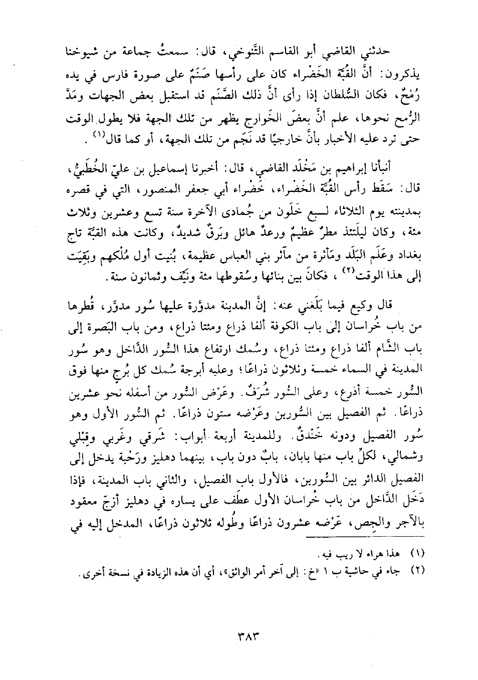 حَدَّثَنِي القاضي أَبُو القاسم التنوخي، قَالَ: سمعت جماعة من شيوخنا يذكرون: أن القبة الخضراء كان على رأسها صنم على صورة فارس في يده رمح، فكان السلطان إذا رأى أن ذلك الصنم قد استقبل بعض الجهات ومد الرمح نحوها، علم أن بعض الخوارج يظهر من تلك الجهة فلا يطول الوقت حتى ترد عليه الأخبار بأن خارجيا قد نجم من تلك الجهة، أو كما قَالَ.