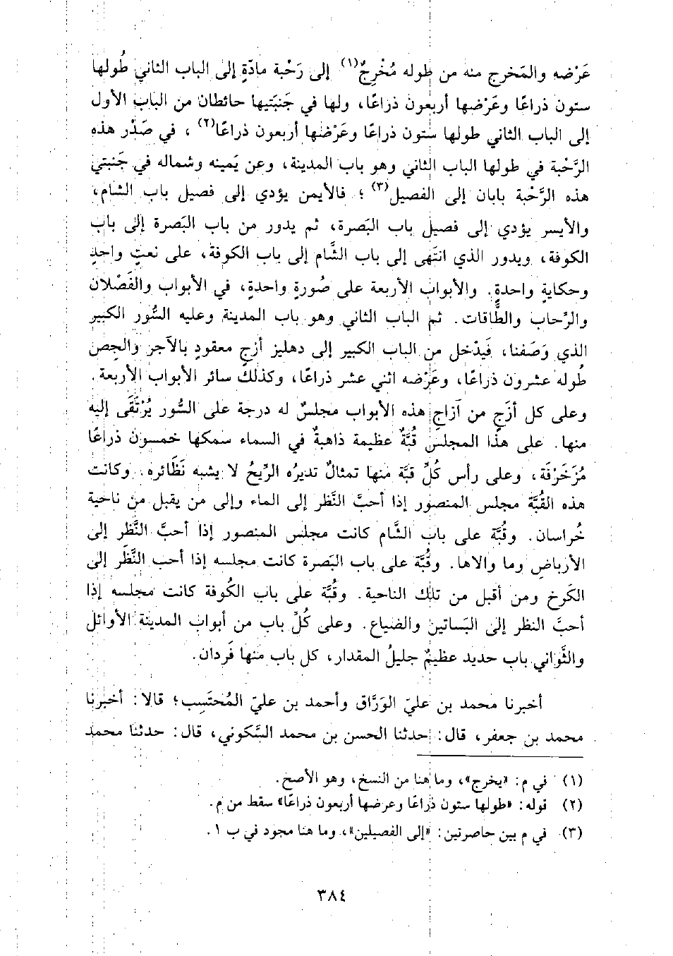 ثم الباب الثاني وهو باب المدينة وعليه السور الكبير الذي وصفنا، فيدخل من الباب الكبير إِلَى دهليز أزج معقود بالآجر والجص، طوله عشرون ذراعا، وعرضه اثني عشر ذراعا، وكذلك سائر الأبواب الأربعة.