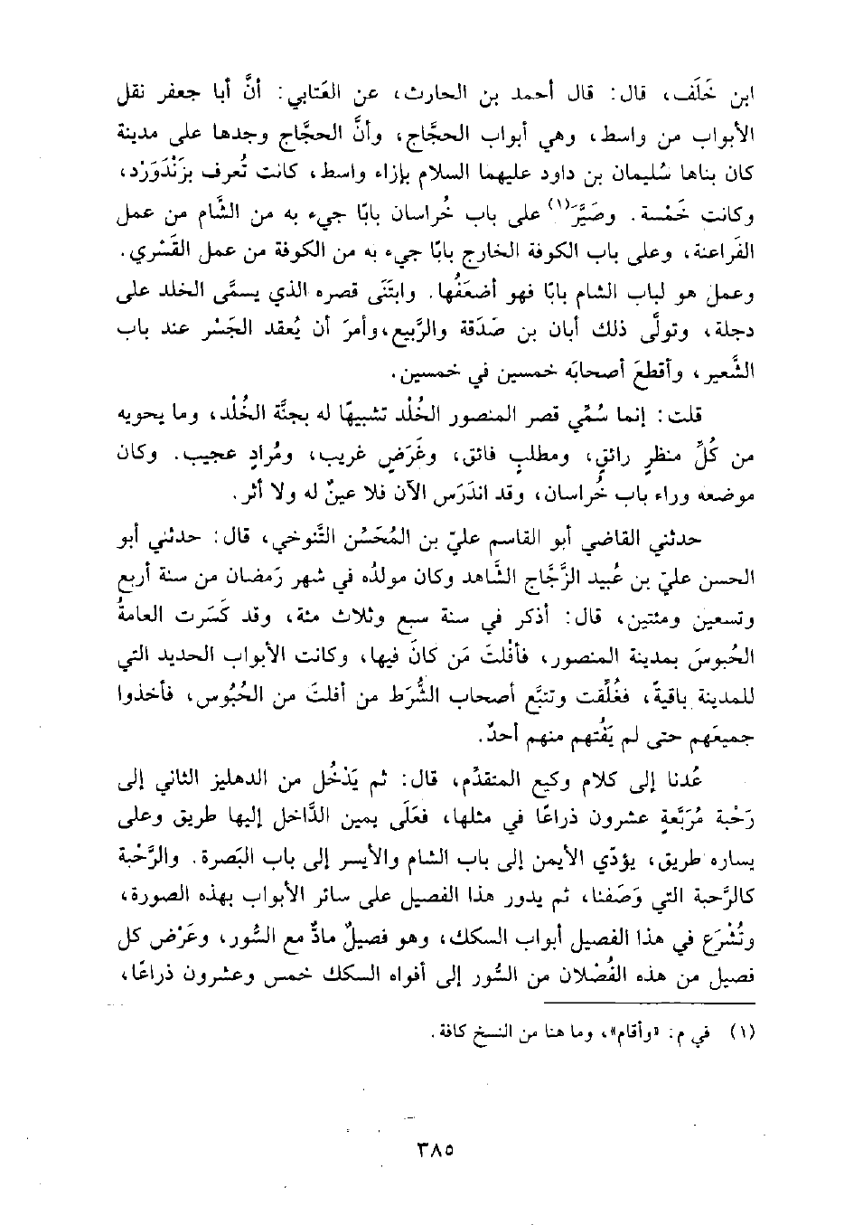 مُحَمَّد ابْن خلف، قَالَ: قَالَ أَحْمَد بْن الحارث، عَنِ العتابي: أن أبا جعفر نقل الأبواب من واسط، وهي أبواب الحجاج، وأن الحجاج وجدها على مدينة كان بناها سُلَيْمَان بْن داود عليهما السلام بإزاء واسط، كانت تعرف بزندورد وكانت خمسة، وصير على باب خراسان بابا جيء به من الشام من عمل الفراعنة، وعلى باب الكوفة الخارج بابا جيء به من الكوفة من عمل القسري.
