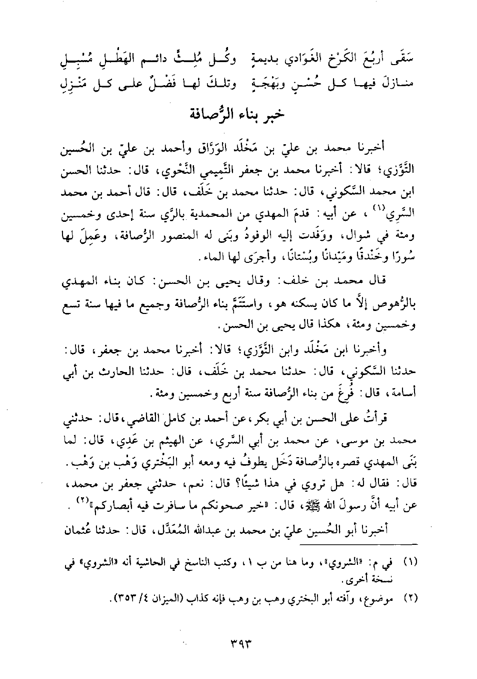 أَخْبَرَنَا مُحَمَّد بْن عَلِيّ بْن مخلد الوراق، وأحمد بْن عَلِيّ بْن الحسين التوزي، قالا: أَخبرنا مُحَمَّد بْن جعفر التميمي النحوي، قَالَ: حَدَّثَنَا الْحَسَن بْن مُحَمَّد السكوني، قَالَ: حَدَّثَنَا مُحَمَّد بْن خلف، قَالَ: قَالَ أَحْمَد بْن مُحَمَّد السري، عَنْ أَبِيهِ: قدم المهدي من المحمدية بالري سنة إحدى وخمسين ومائة في شوال، ووفدت إليه الوفود وبنى له المنصور الرصافة، وعمل لها سورا وخندقا وميدانا وبستانا، وأجرى لها الماء.