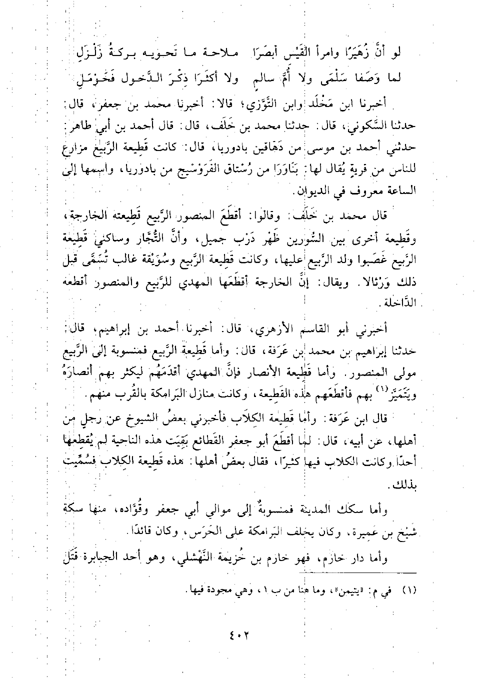 أَخْبَرَنَا ابْن مخلد وابن التوزي، قالا: أَخبرنا مُحَمَّد بْنُ جَعْفَرٍ، قَالَ: حدثنا السكوني، قَالَ: حدثنا مُحَمَّد بْن خلف، قَالَ: قَالَ أَحْمَد بْن أَبِي طاهر: حَدَّثَنِي أَحْمَد بْن مُوسَى من دهاقين بادوريا، قَالَ: كانت قطيعة الربيع مزارع للناس من قرية، يقال لها: بناورا من رستاق الفروسيج من بادوريا واسمها إِلَى الساعة معروف في الديوان.