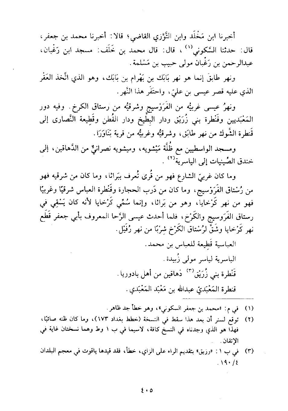 وفيه دور المعبديين وقنطرة بني زريق ودار البطيخ ودار القطن وقطيعة النصارى إِلَى قنطرة الشوك من نهر طابق، وشرقيه وغربيه من قرية بناورا.